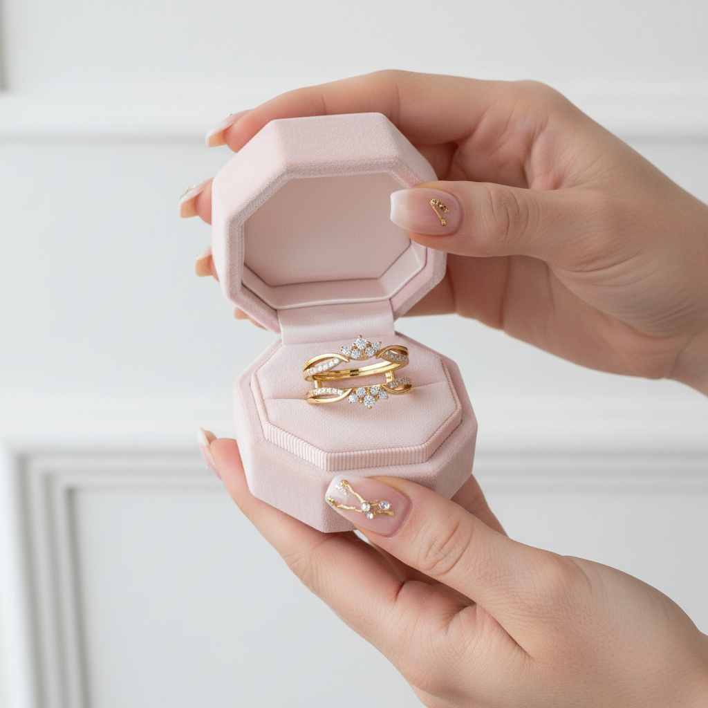 Rose gold ring and diamond ring on a pink velvet box with blurred flowers in the background
