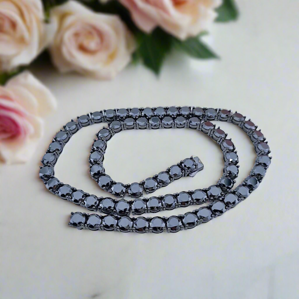 Elevate your jewelry collection with our luxurious Black Certified Moissanite Tennis Necklace from Black Diamonds New York. Made with stunning black certified moissanite, each stone is carefully set in 925 Silver and dipped 5x in white gold plating for a dazzling finish. This high-quality piece is not only affordable but truly worth the investment. Shine bright and make a statement with this exquisite necklace.