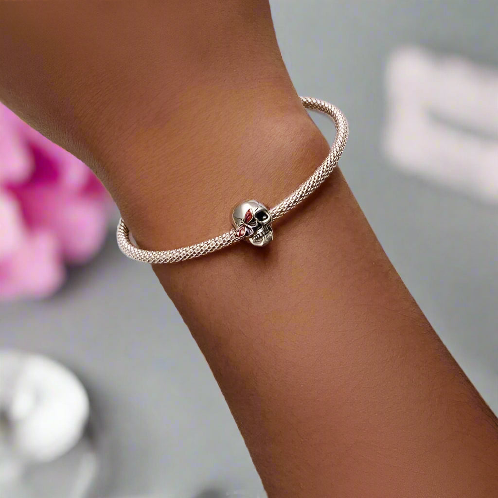 The Diablo Skull & Butterfly Charm Bead from Black Diamonds New York is crafted from 92.5% pure silver and hypoallergenic metals, with a delicate enamel finish. It offers a unique, stylish accent for punk or gothic looks.
