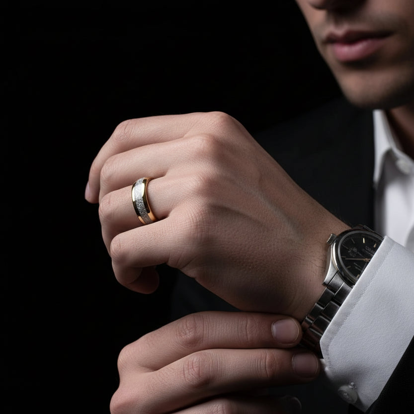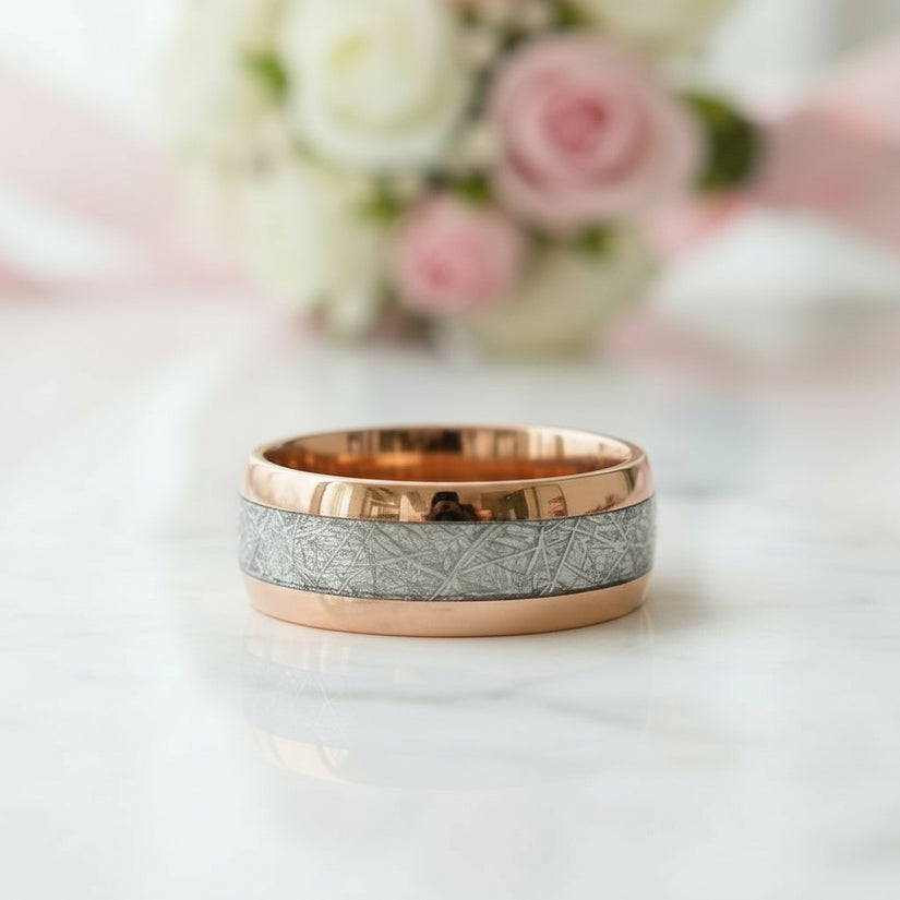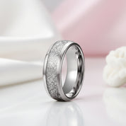 Elevate your style with this 8mm polished tungsten wedding band featuring a unique meteorite inlay. Combining durable craftsmanship with celestial beauty, it offers timeless elegance for your special day.