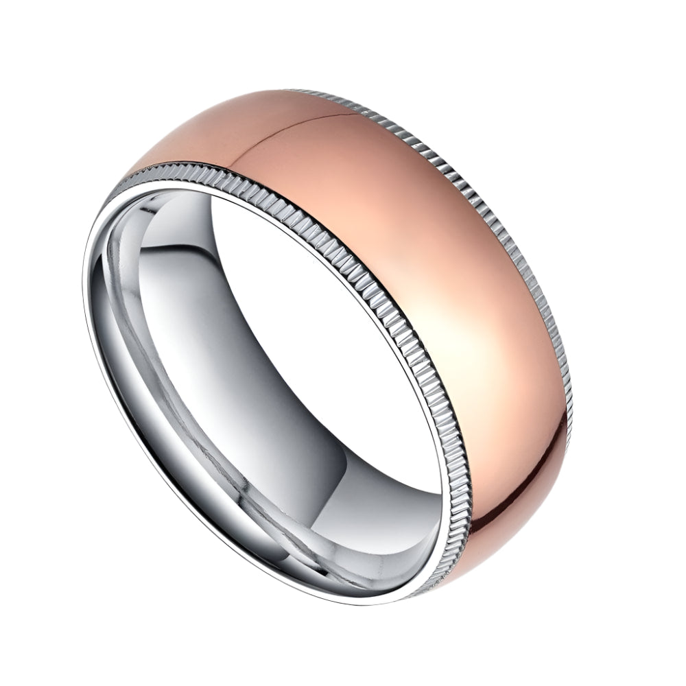 Behold the elegance of our 8mm Rose Gold Simple Dome Titanium Wedding Band by Black Diamonds New York. This stunning band boasts a classic dome shape and a luxurious rose gold hue that exudes sophistication. Made with high-quality titanium, this ring is not only gorgeous but also durable. Elevate your wedding ensemble with this affordable yet luxurious piece.