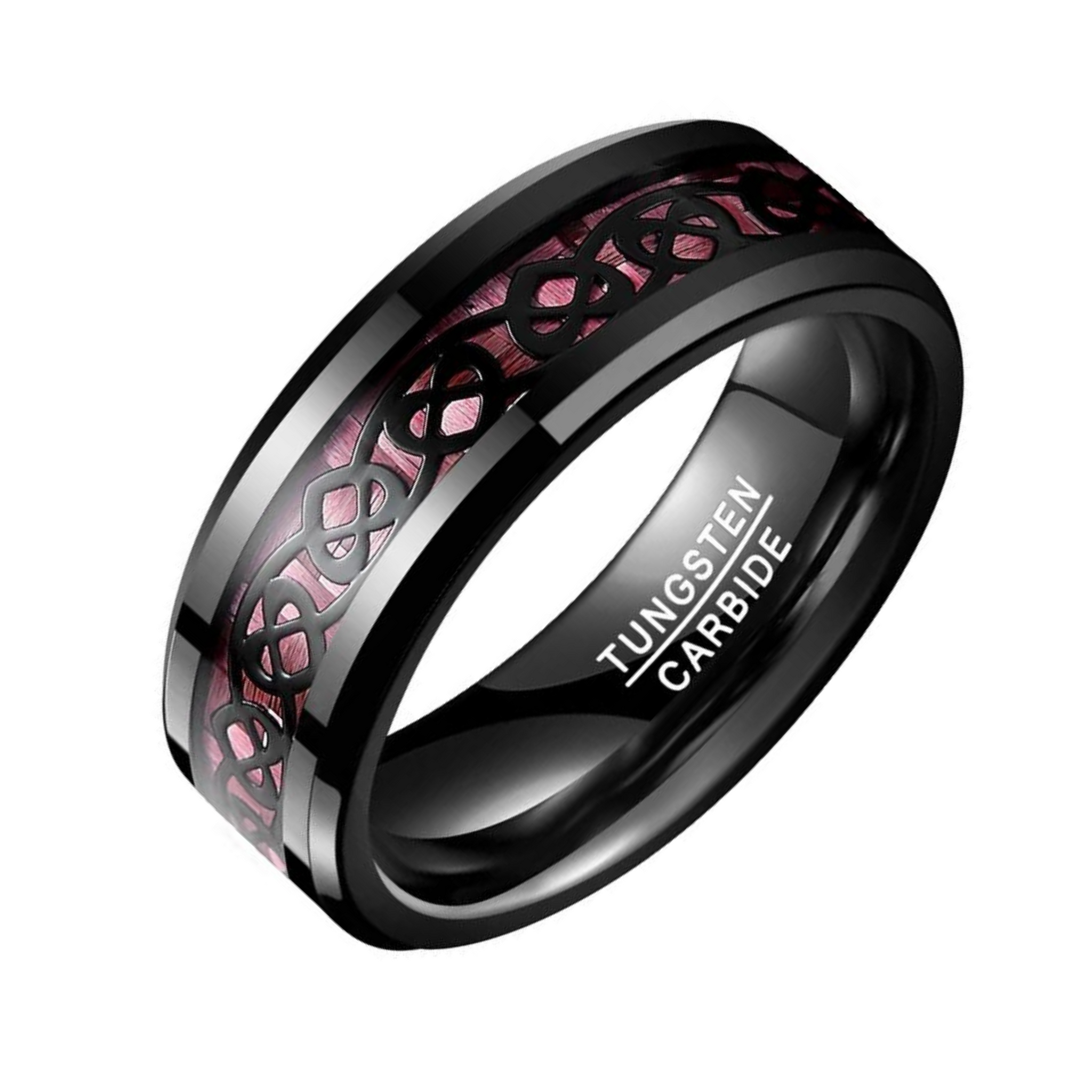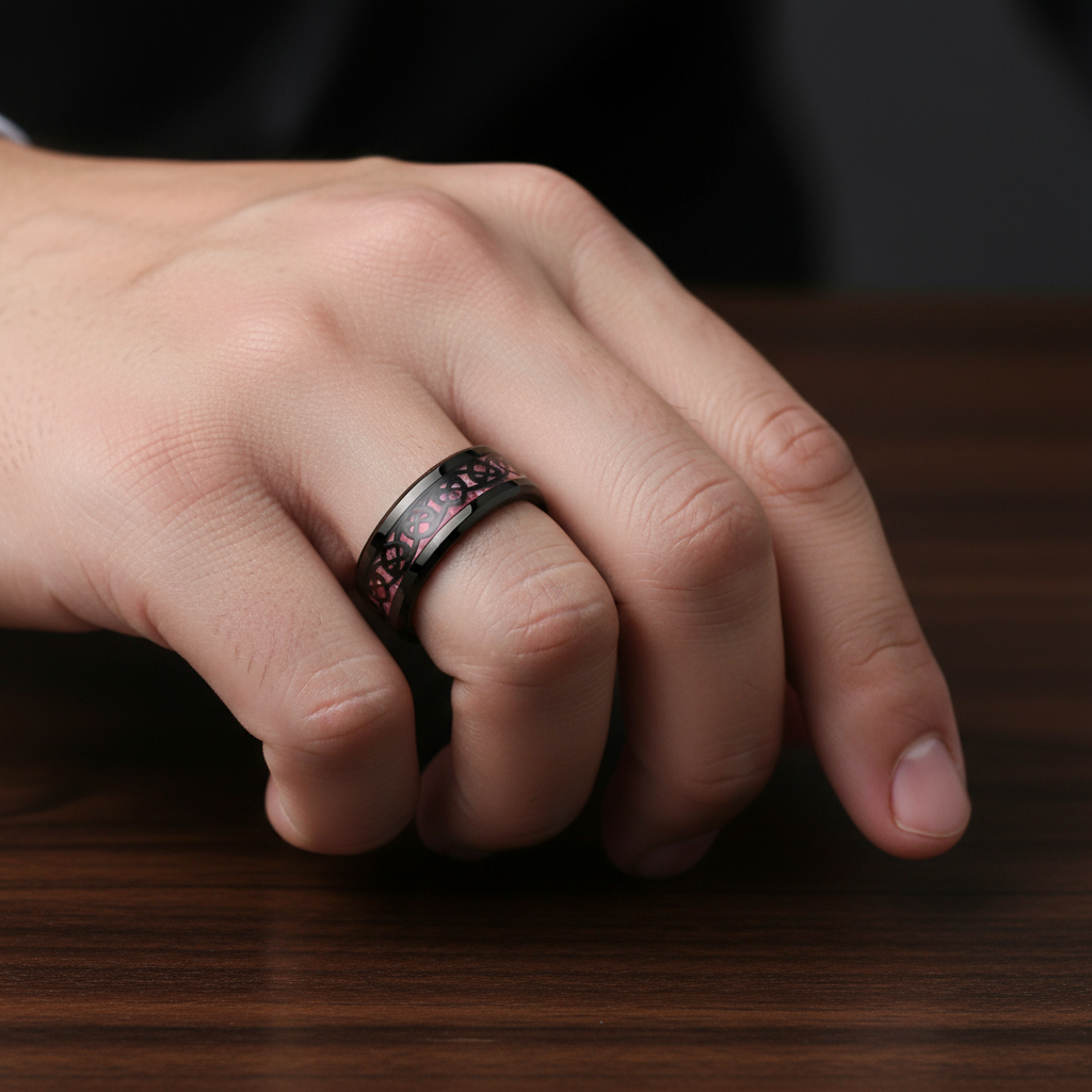 This men's ring combines durable tungsten carbide with striking pink carbon fiber for a unique look. Its sleek black plating and polished beveled edge add refined style, making it a bold yet elegant accessory for everyday wear.