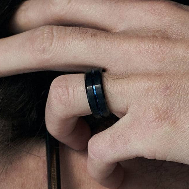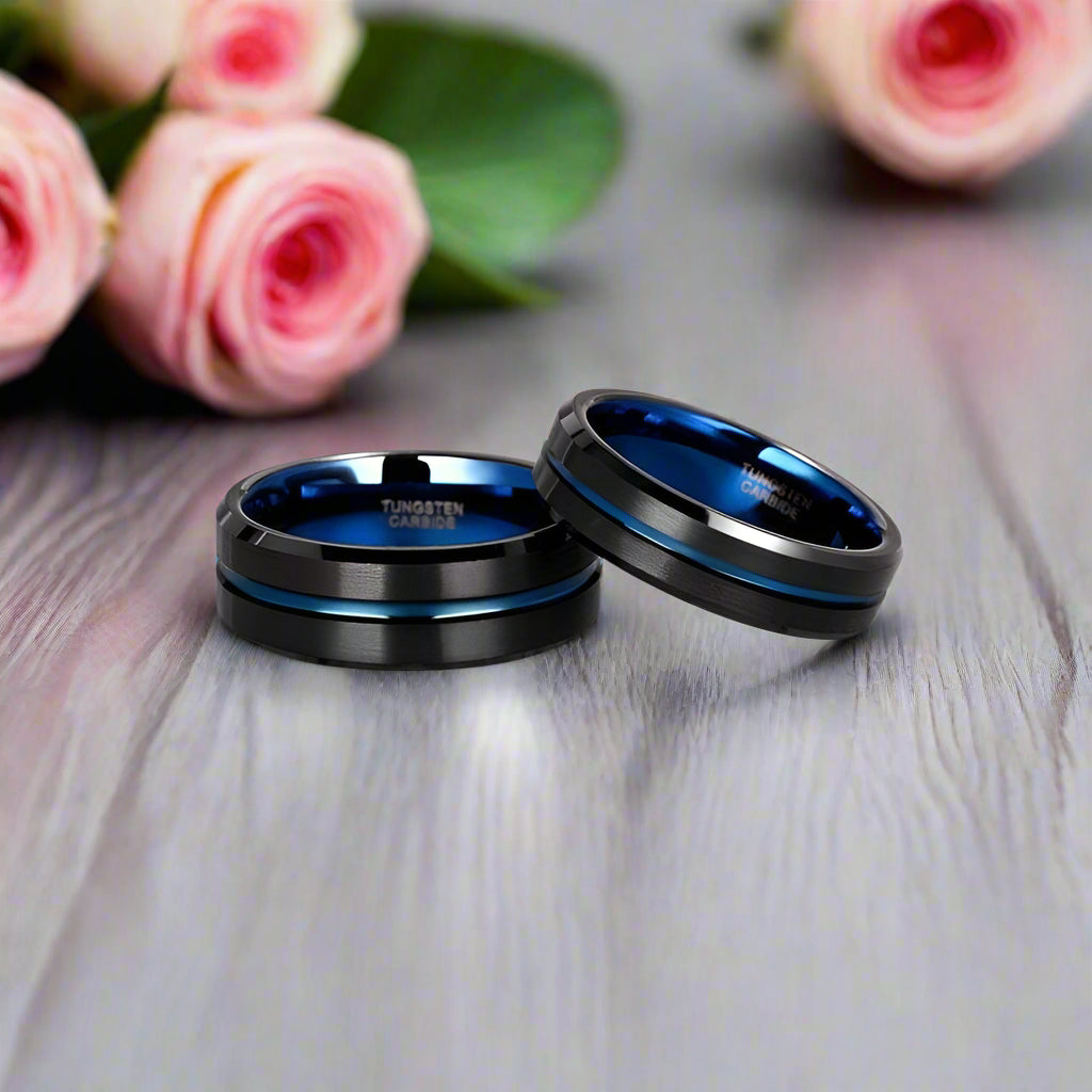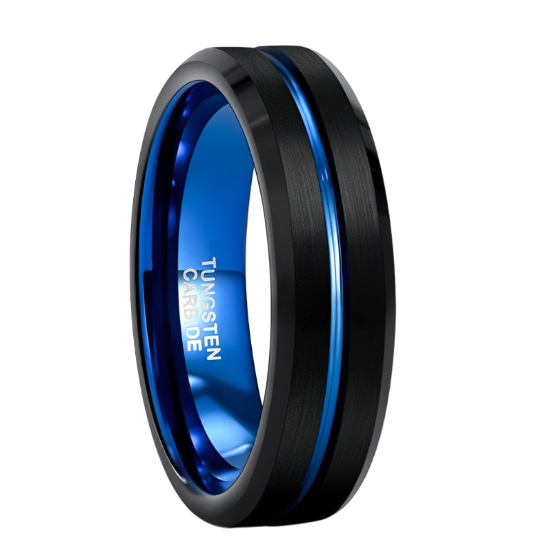 Experience lasting quality with this Men's Tungsten Carbide Wedding Band featuring a bold blue line. Crafted from premium, ethically sourced materials, it offers durability and style without the high price of typical wedding bands.