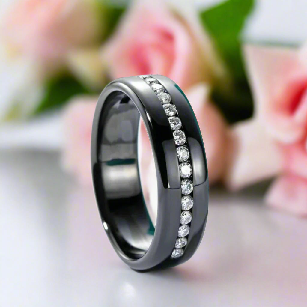 Experience refined elegance with the Round Cut Certified Moissanite Black Unisex Wedding Band from Black Diamonds New York. This lightweight, comfortable band features brilliant round cut moissanite stones, offering timeless beauty for both men and women. Crafted with precision, it combines sophistication with affordability for a stunning accessory suitable for any occasion.