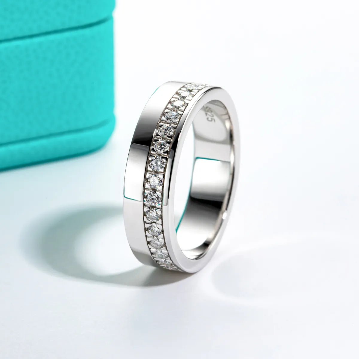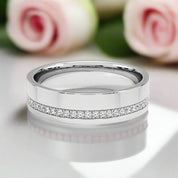 Fall in love with the unparalleled elegance of our Unisex Wedding Band with Round Certified Moissanite Inlay by Black Diamonds New York. Designed to make a statement, this exquisite band features a round cut moissanite set in 925 silver dipped 5x in 18K white gold, combining durability and sophistication. The stunning D color of the stone creates a gorgeous focal point that shines and sparkles with every movement. With its affordable price and luxurious design, this shimmering wedding band is a must-have for those seeking a piece that exudes both style and class.