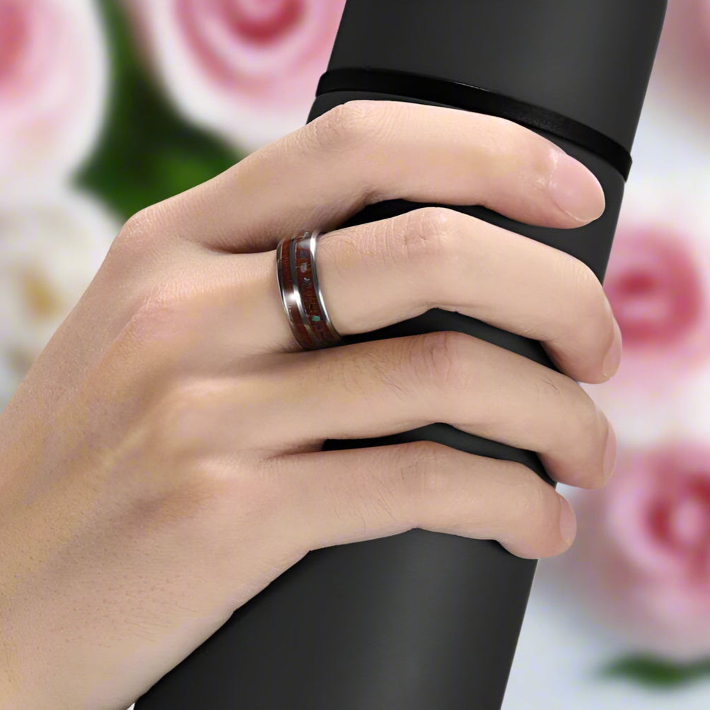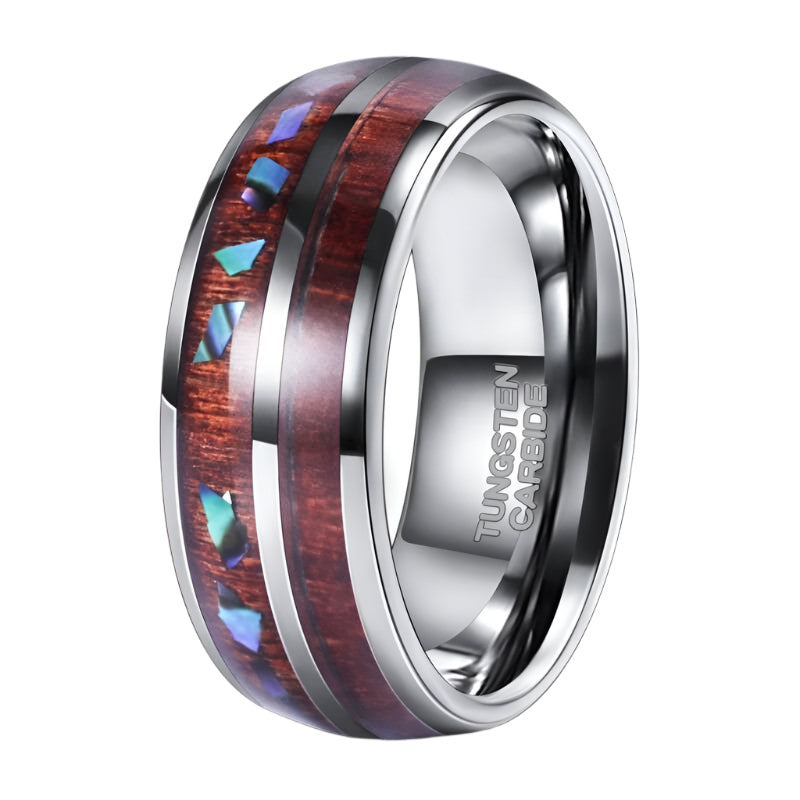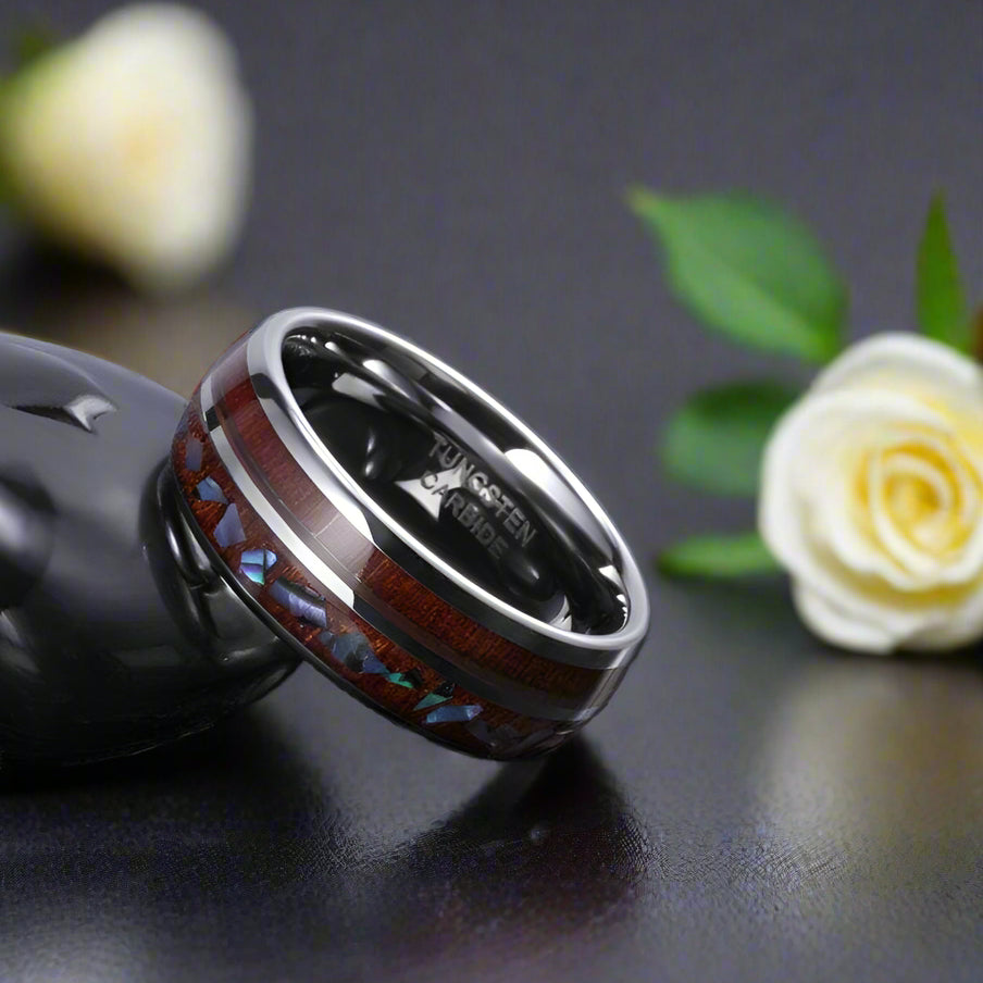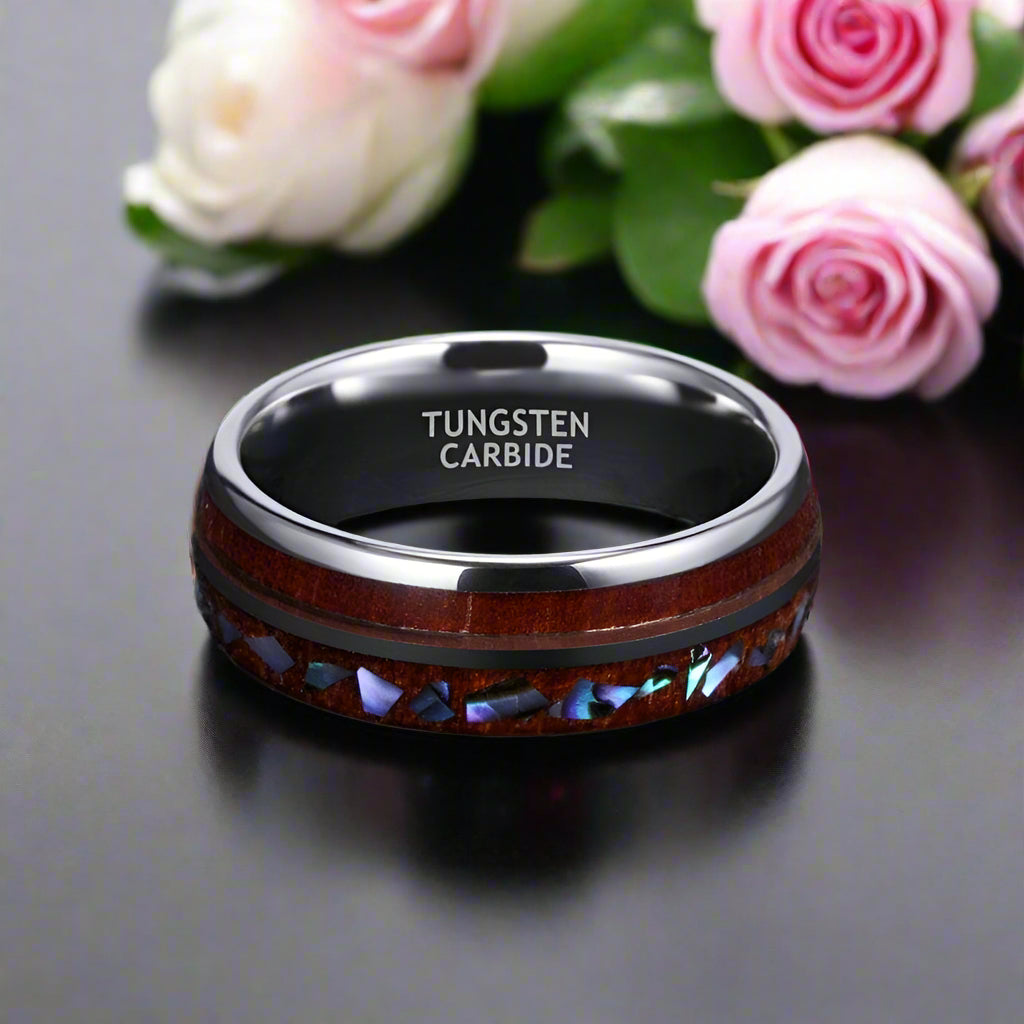 This Wood & Shell men's tungsten wedding band combines durable, ethically sourced materials with timeless style for a lasting, affordable choice.