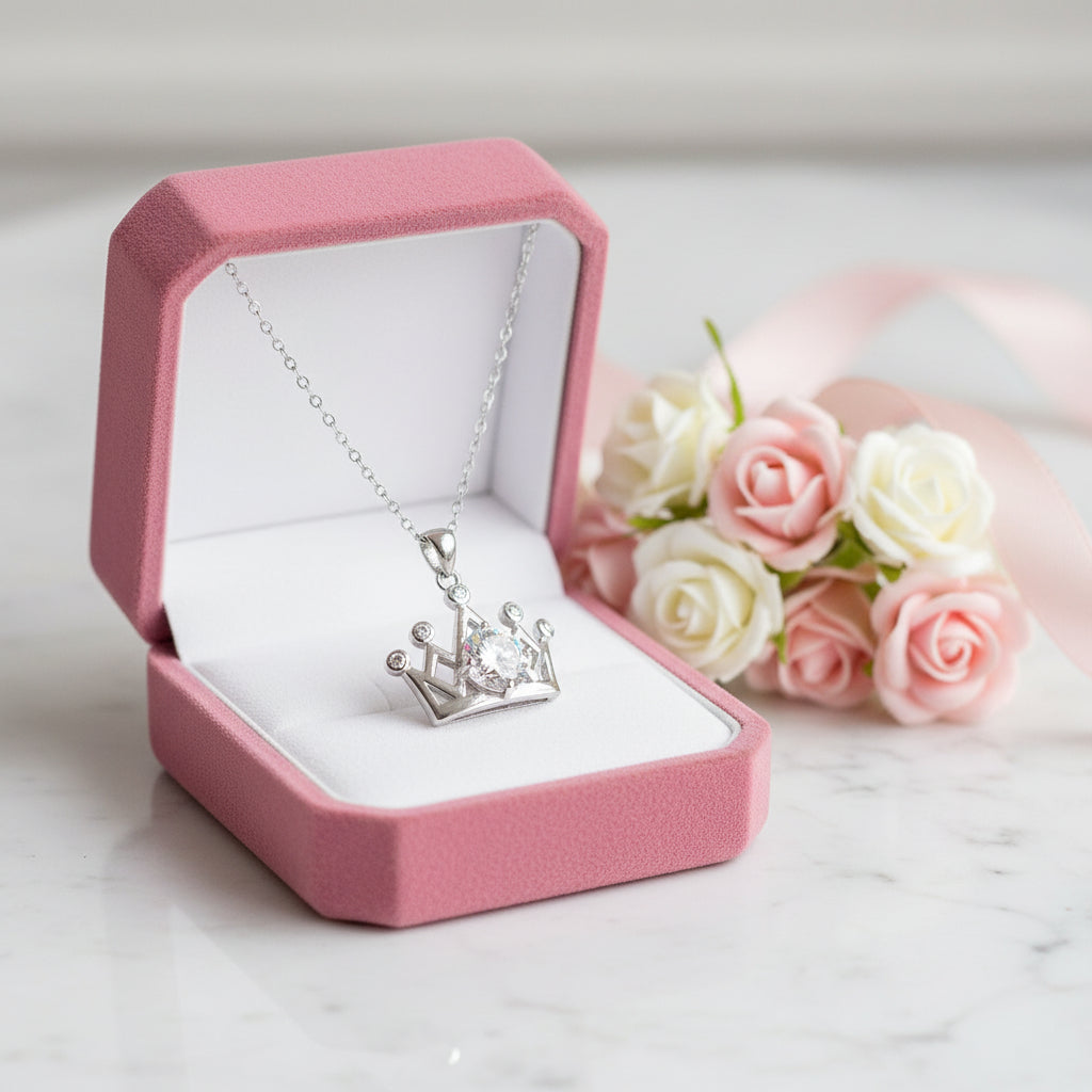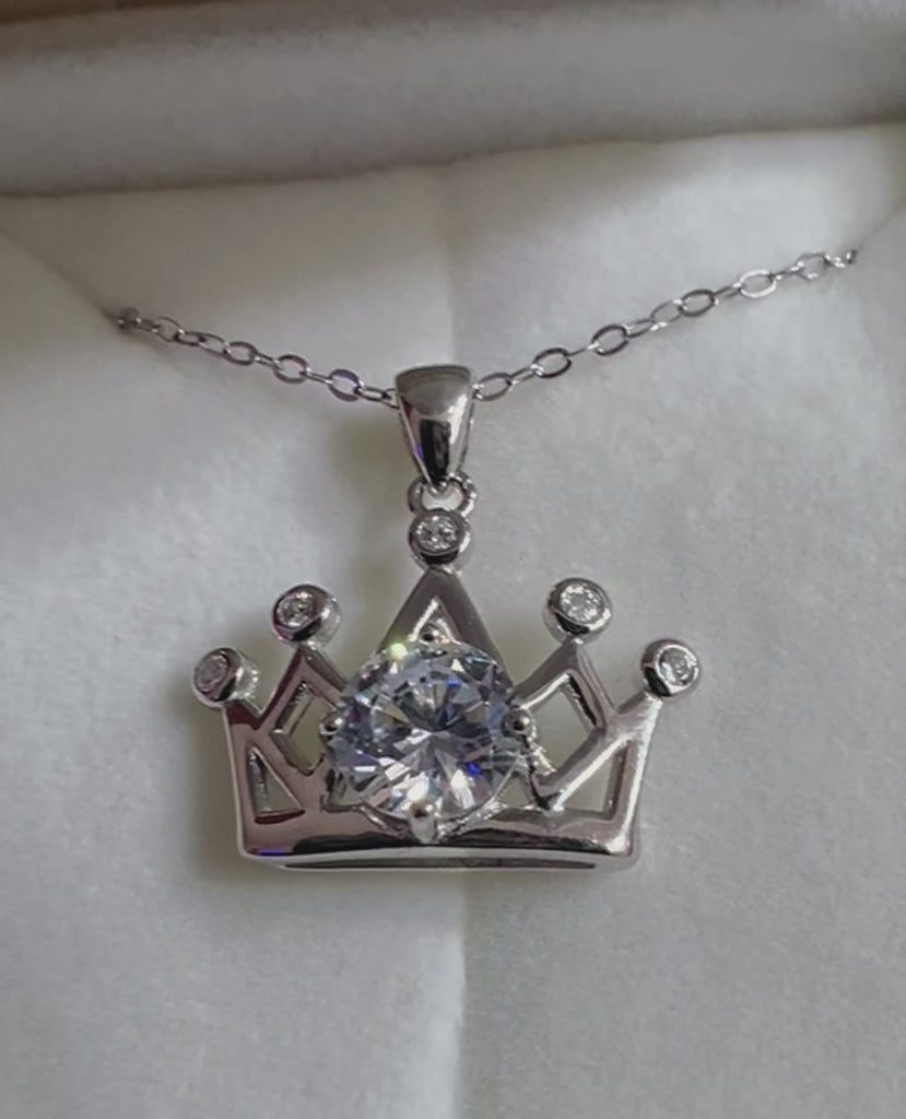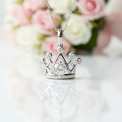 Discover the elegance of our 1.0 Ct Round Cut Certified Moissanite Crown Necklace. Meticulously crafted, it showcases a brilliant round cut Certified Moissanite stone secured by prong and bezel settings for enhanced sparkle and durability. The charming crown motif lends a regal sophistication, inspired by celebrity glamour, perfect for elevating any ensemble.
