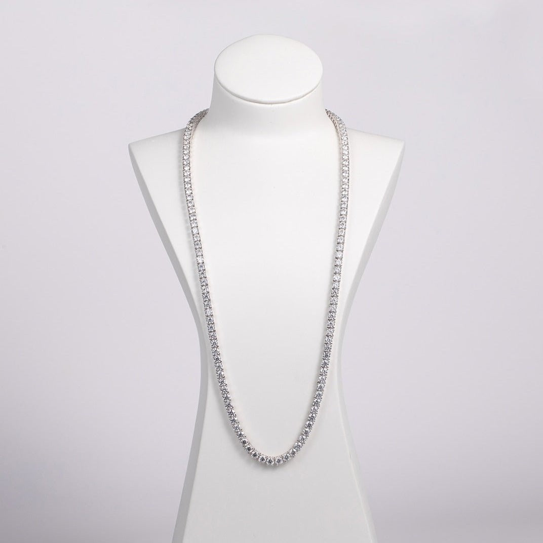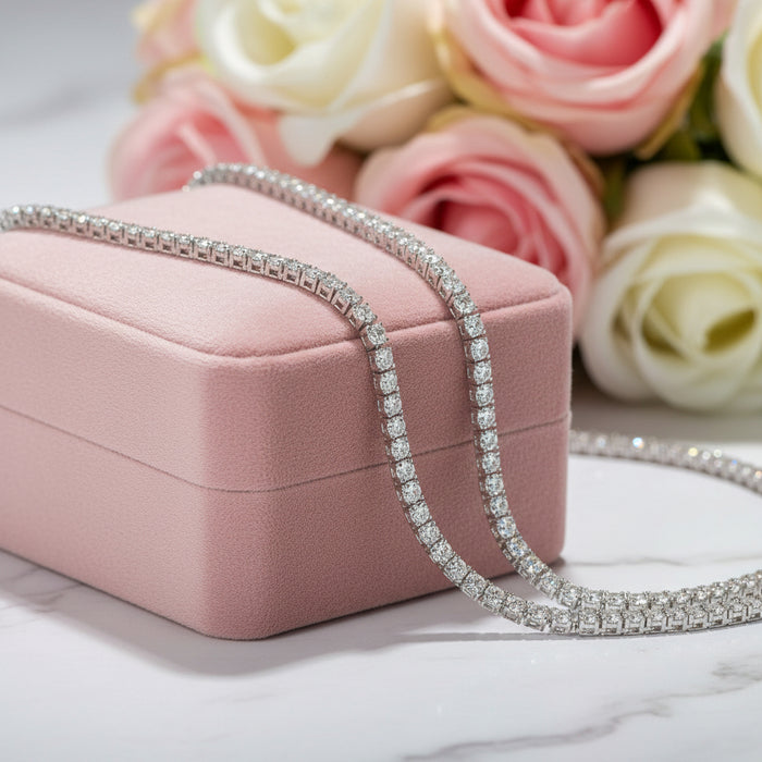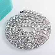Fall in love with the flawless fusion of fashion and sophistication with our stunning 4mm Round Cut Certified Moissanite Tennis Necklace. Every diamond is skillfully crafted to capture and reflect maximum light, resulting in a brilliant shine that radiates in any setting. The 925 silver dipped in 18k white gold adds an element of elegance to this irresistible piece. Treat yourself or give a loved one the gift of luxury with this exquisite necklace.