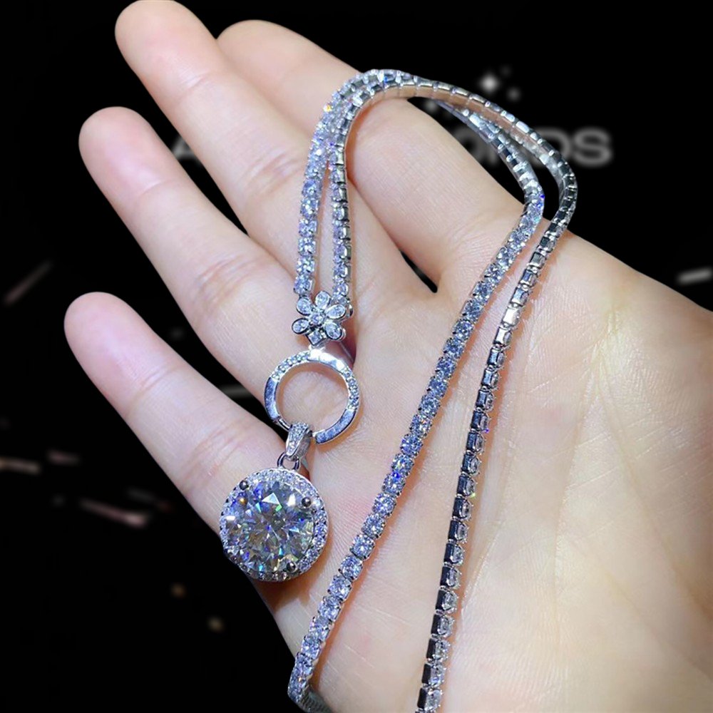 Make a statement with our 5.0 Ct Certified Moissanite Chain Necklace by Black Diamonds New York. This stunning piece features a round cut diamond in a halo frame design, exuding beauty and sophistication. Crafted with high quality 925 silver dipped 5x in 18k white gold, this gorgeous necklace offers both affordability and luxury. Elevate your style with this tantalizing accessory that is sure to add a touch of glamour to any outfit.