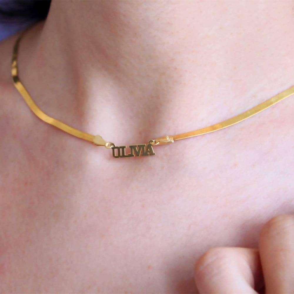 Elevate your style with our stunning Custom Snake Chain Name Necklace by Black Diamonds New York. This gorgeous piece is the perfect way to showcase your unique identity with a custom name pendant on a sleek snake chain. Made with high quality materials and 18k gold plating, this necklace exudes luxury at an affordable price.