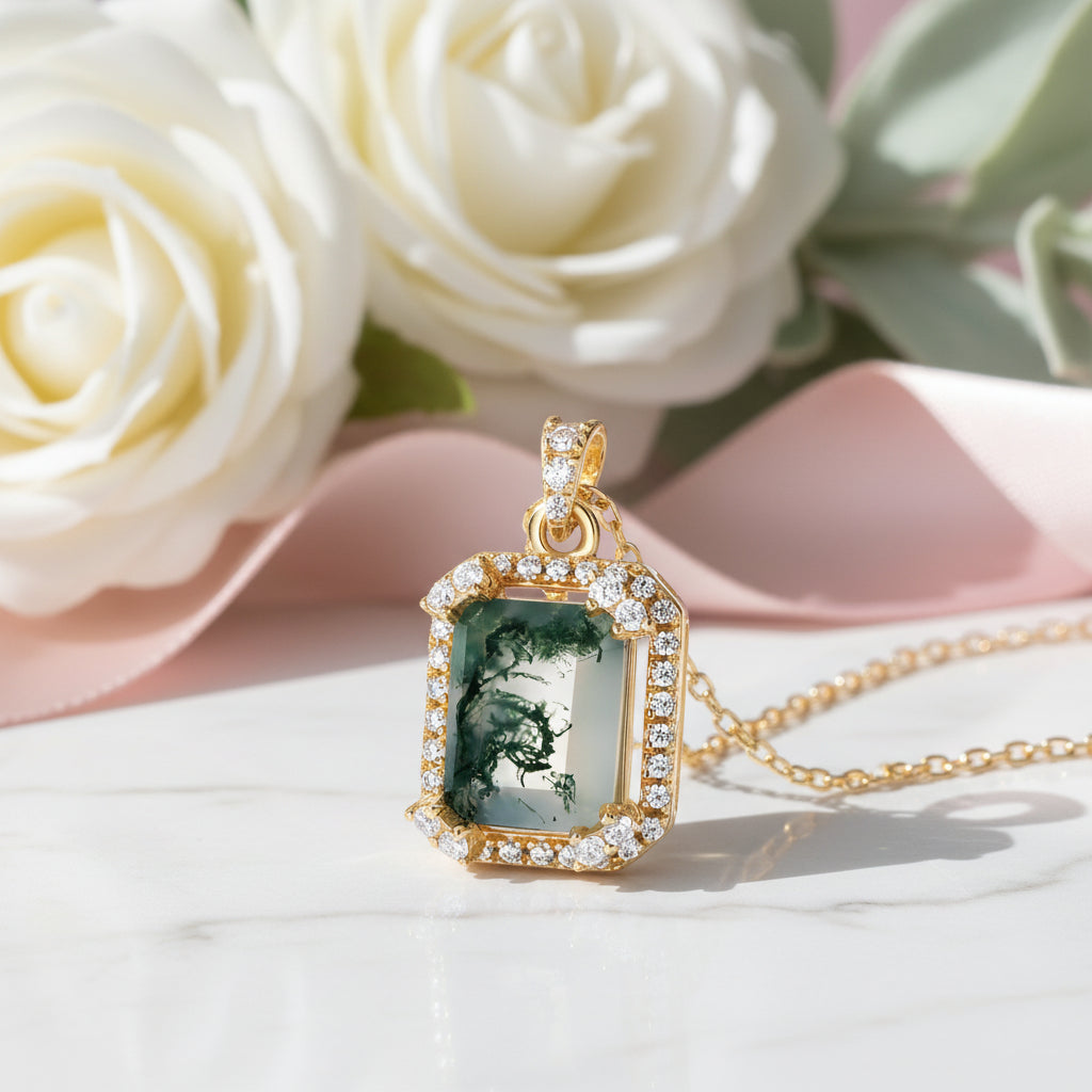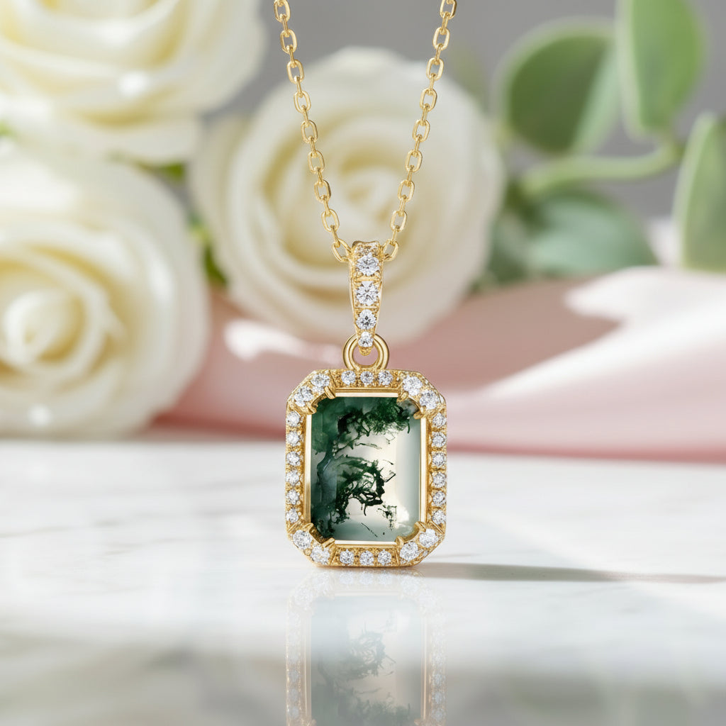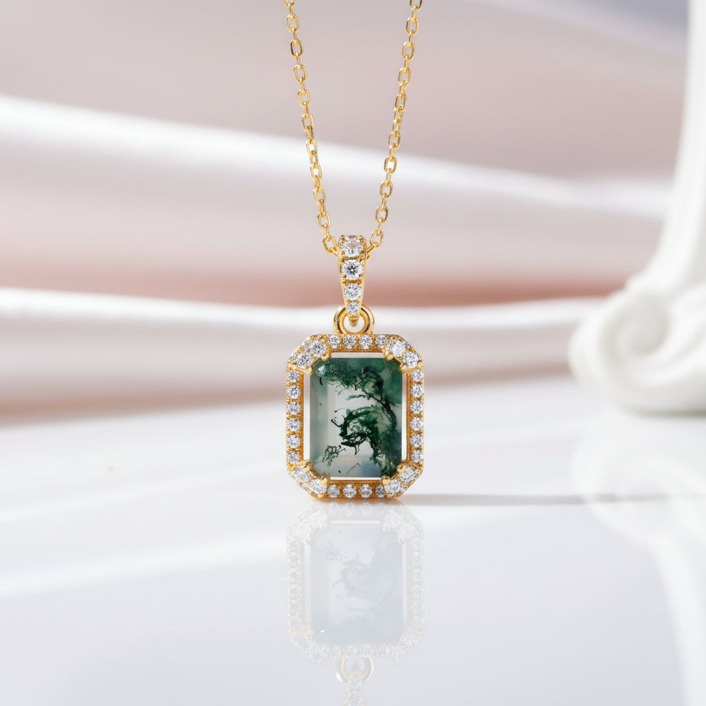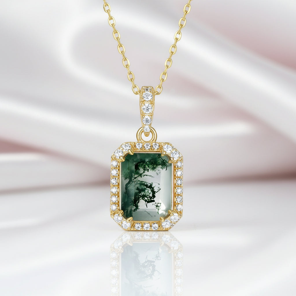 Embrace the earthy beauty of our Natural 7*9mm Green Moss Agate Necklace! With an emerald cut stone held securely by prongs, this gem is surrounded by a halo of twinkling accents. Perfect for complementing any outfit, this necklace is sure to be a conversation starter.