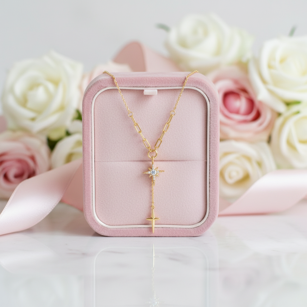 Embrace sophistication and beauty with our Star Cross Necklace with Round Diamond Alternative . This gorgeous piece is designed to captivate and enchant, adding a touch of glamour to any outfit. Meticulously crafted with 925 silver and dipped 5 times in 18k gold, this stunning necklace is a must-have for those who appreciate quality and affordability in their accessories. Elevate your ensemble with this sparkly and exquisite necklace today.
