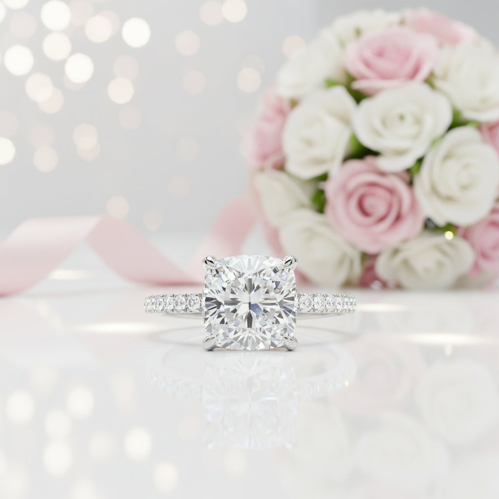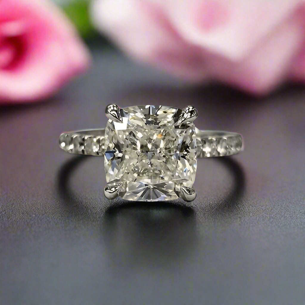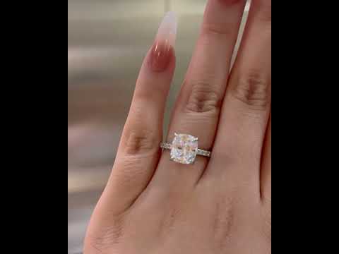 Say “I do” in style with a 3.0ct Cushion Cut Certified Moissanite Engagement Ring from Black Diamonds New York. This luxurious ring is crafted from 14k white gold and is adorned with a cushion-cut clear center diamond, and luminous round side stones - all at an unbeatable and affordable price. Be swept away with a high-quality ring that is breathtakingly gorgeous—courtesy of Black Diamonds New York.
