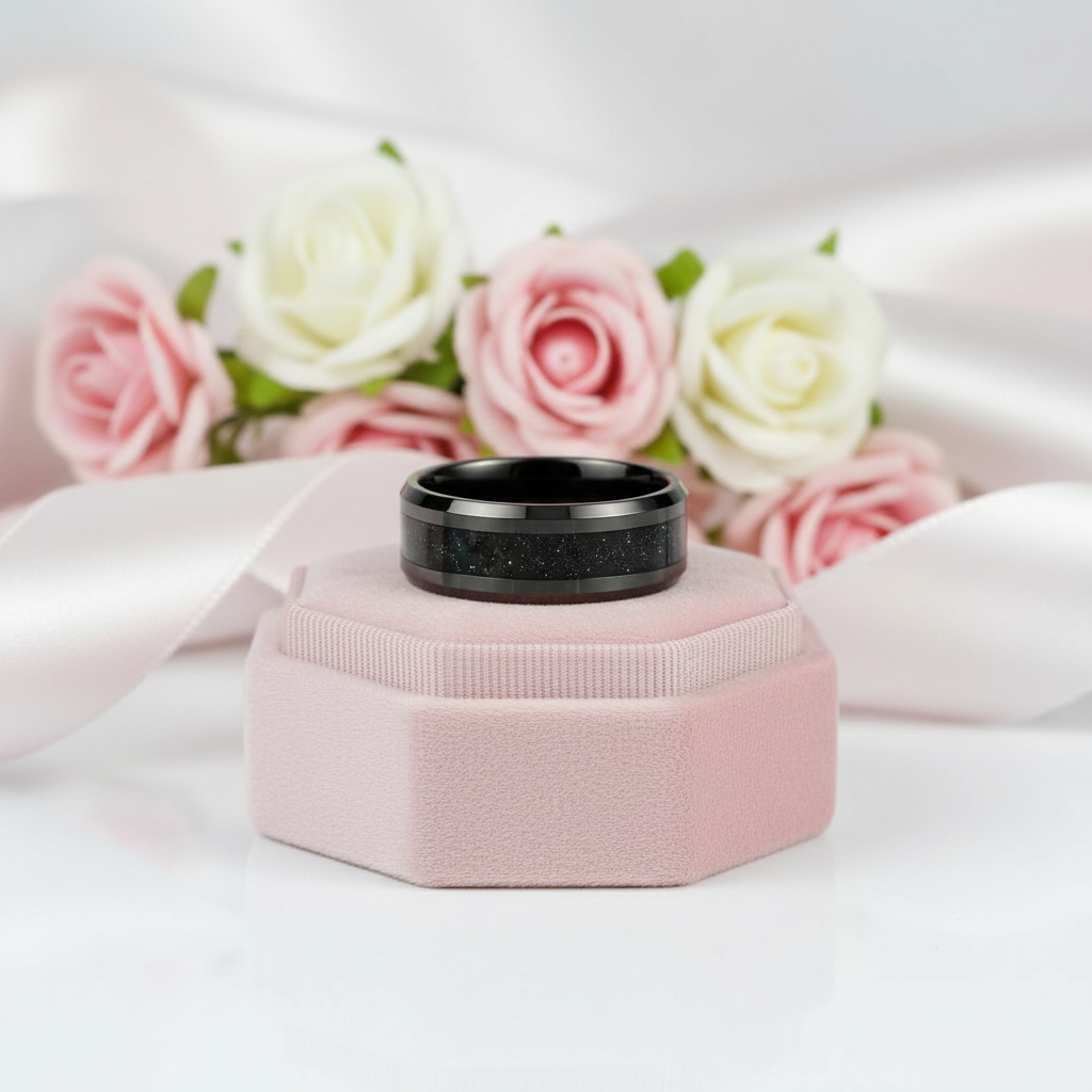 This 8mm tungsten wedding band features a sleek beveled edge and a striking black sandstone inlay. Its polished finish offers a modern yet timeless look, while the lightweight design ensures all-day comfort. Perfect for marking unforgettable moments with understated elegance.