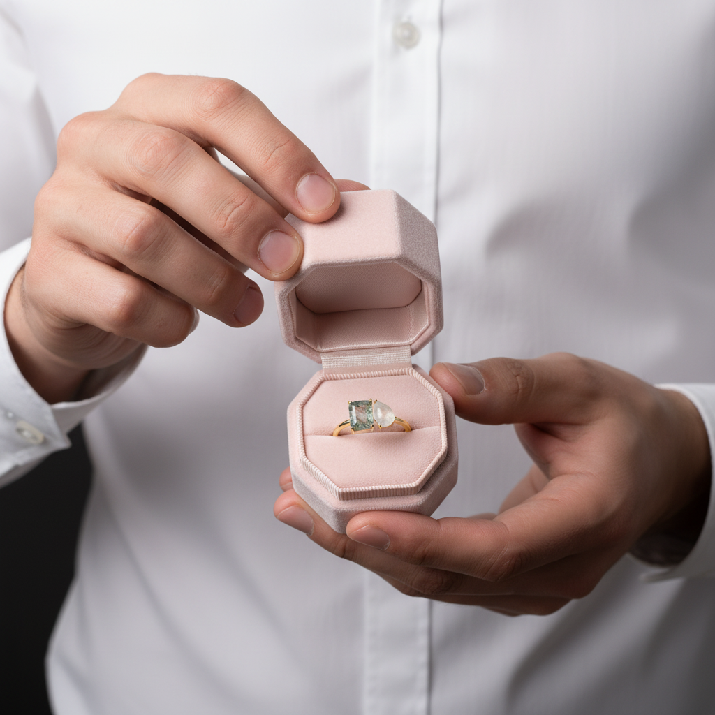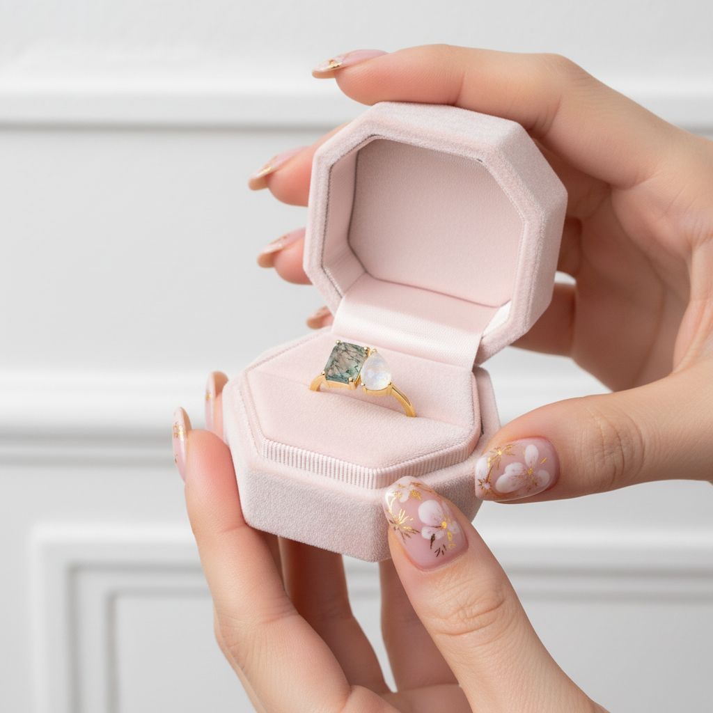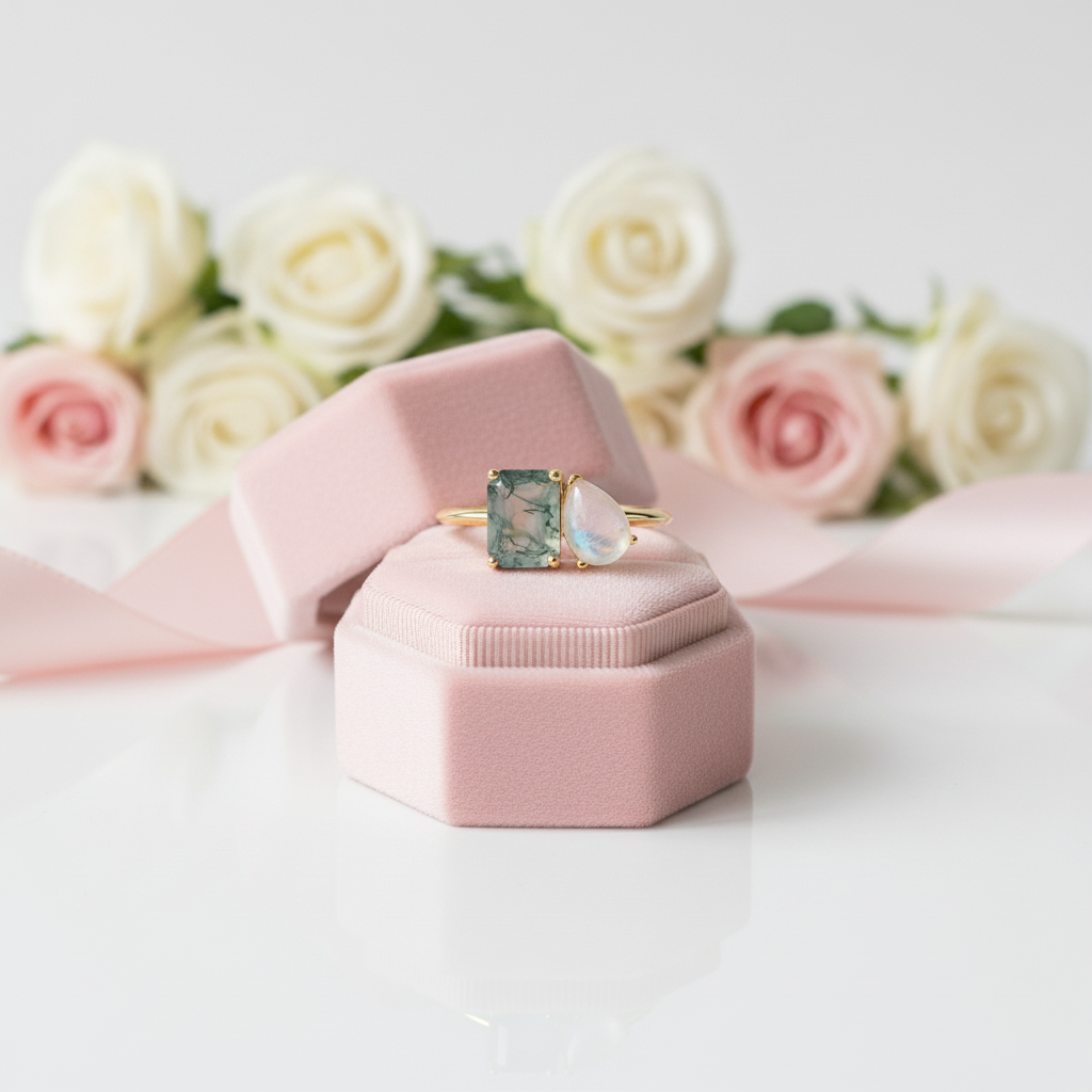Fall in love with the heavenly beauty of our Milky Blue Moonstone Moss Agate Engagement Ring. The emerald-cut moss agate and the exquisite pear-cut moonstone are held in place by sturdy prongs that ensure their durability. This dual-stone engagement ring is a unique combination that is sure to make heads turn.