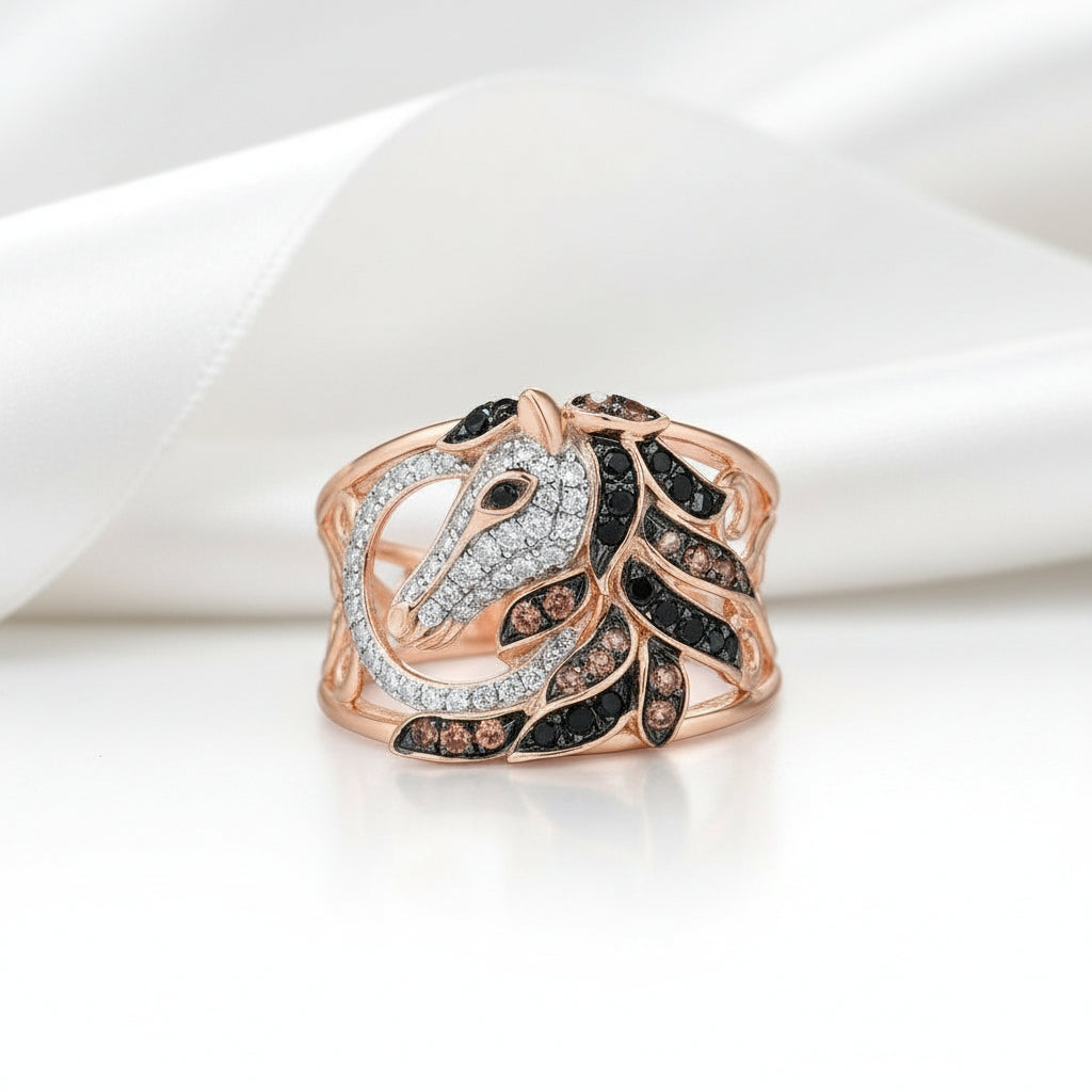 Inspired by the grace of nature, this rose gold ring showcases a striking horse motif paired with gemstones. Each piece is individually handcrafted using premium materials and sustainable sourcing practices, ensuring you're investing in quality that lasts. The distinctive design breaks away from conventional jewelry, making it an ideal choice for those seeking something with real character and substance. Wear a ring that honors both artistry and your personal values.