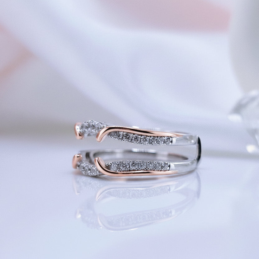 Enhance the beauty of your round-cut diamond ring with the exquisite Diamond Alternative Rose Gold Accent Ring Enhancer. Crafted with a silver band and adorned with mesmerizing rose gold accents, this ring enhancer effortlessly elevates the elegance of your existing ring. Designed to perfectly fit and complement any round-cut diamond, it adds an extra flair and sparkle to your beloved piece. With its lightweight design and stunning craftsmanship, this enhancer is both comfortable to wear and visually captivating. Upgrade your style with this enchanting piece and indulge in the allure of Diamond Alternative .