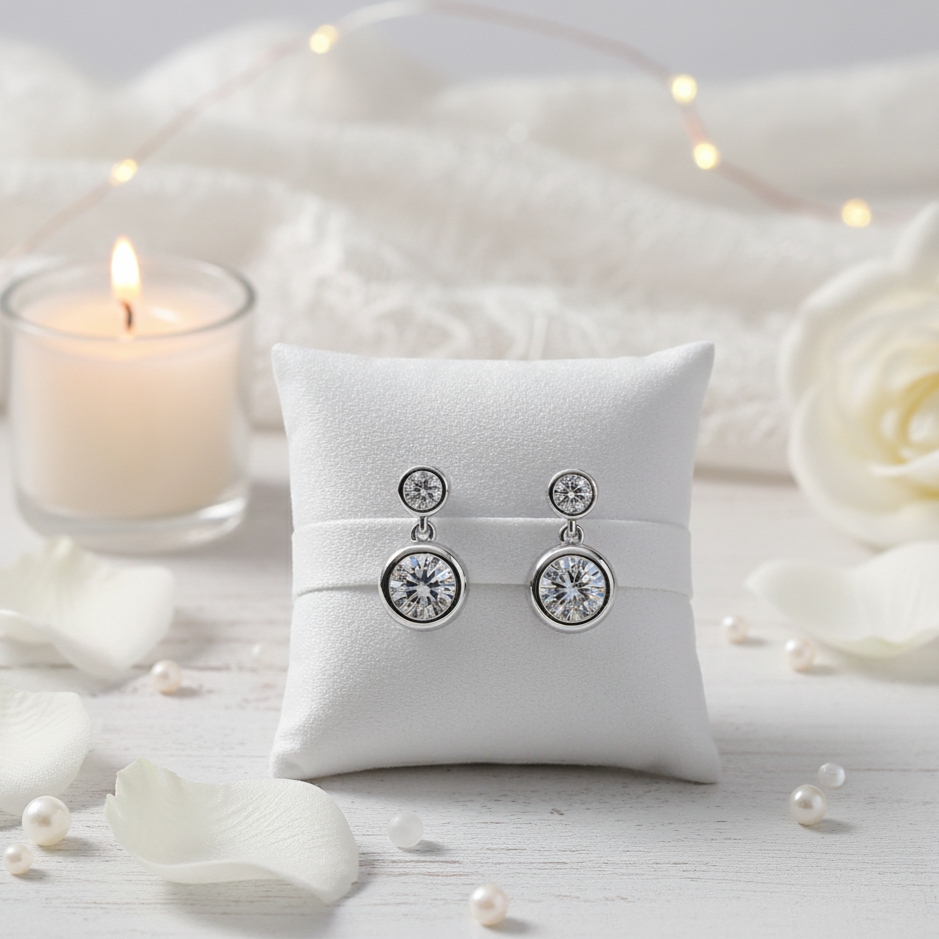 Introducing our celebrity inspired 1.2 Ctw Round Cut Certified Moissanite Drop Earrings - the perfect addition to elevate any outfit! Crafted with high-quality moissanite stones in a stunning bezel setting, these stud earrings exude elegance and shine like no other. Whether you're dressing up for a special occasion or simply want to add some sparkle to your day-to-day look, these earrings are sure to impress.