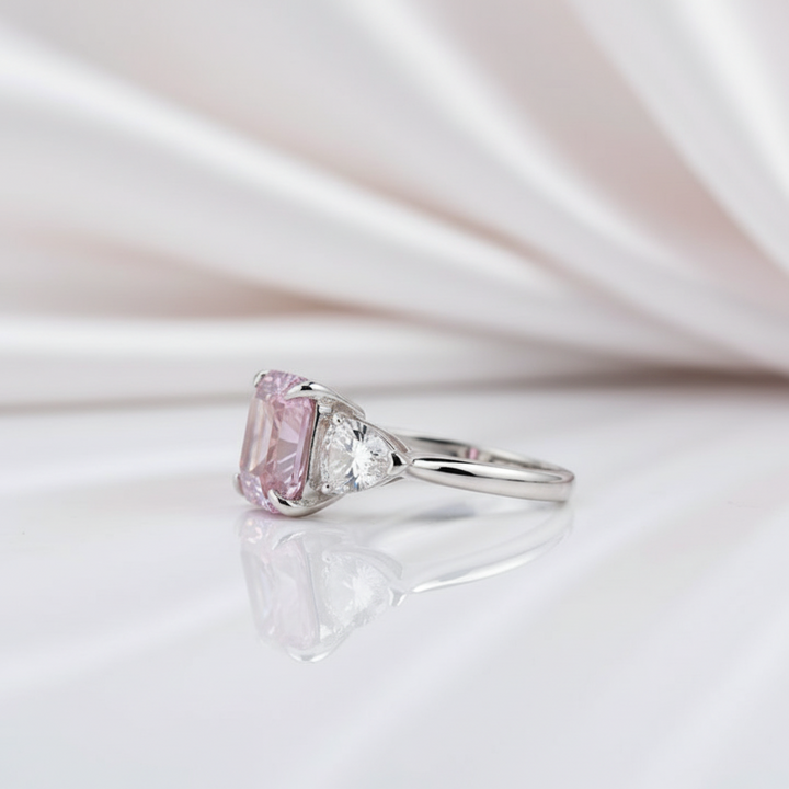 Pink Sapphire Asscher Cut and Trillion Cut Three Stone Engagement