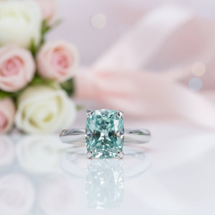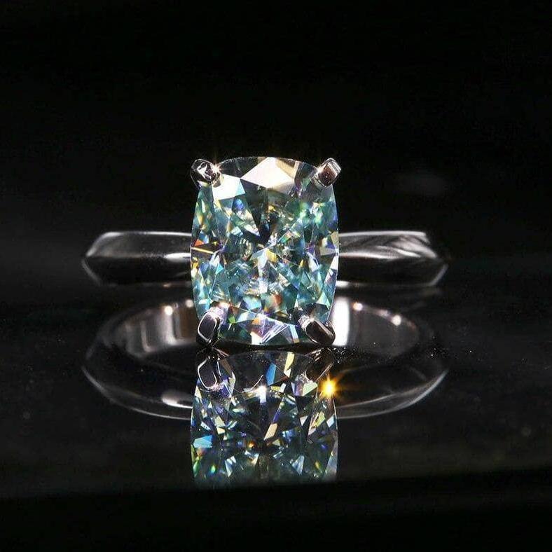 Rare Blue Green Cushion Cut Certified Moissanite Ring