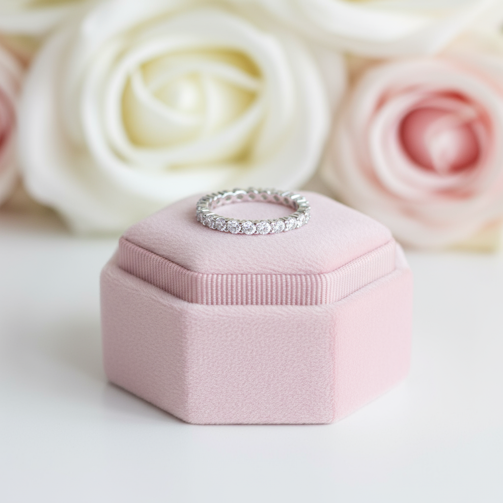 Rose gold ring and diamond ring on a pink velvet box with blurred flowers in the background