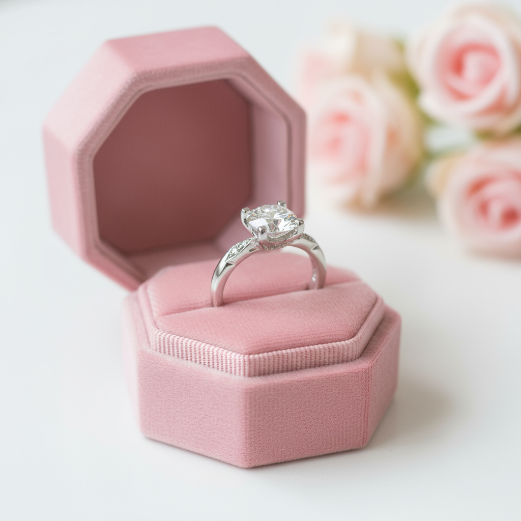 Rose gold ring and diamond ring on a pink velvet box with blurred flowers in the background