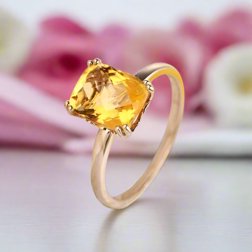 This 14K rose gold yellow citrine engagement ring is an exceptional choice for those searching for a stunning and substantial addition to their jewelry collection. Featuring a 3.1ct cushion cut citrine, it is a luxurious and dazzling way to express your affection. Its excellent craftsmanship ensures that this ring is both beautiful and affordable.