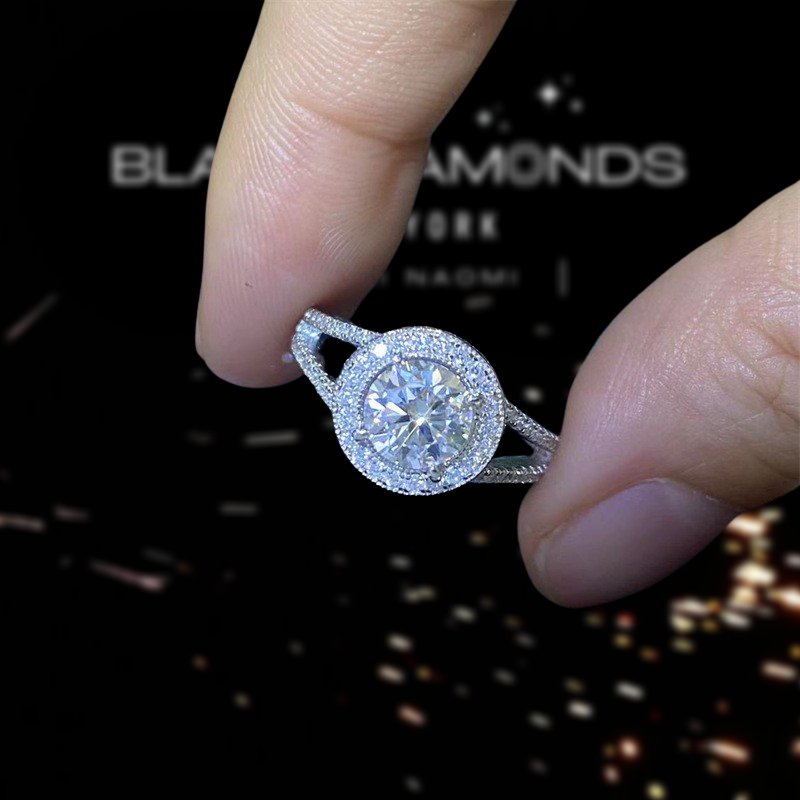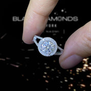 Indulge in the allure of the 1 carat Round Cut Certified Moissanite Split Shank Engagement Ring by Black Diamonds New York. Mesmerizing and captivating, this ring boasts a halo of shimmering stones that enhance the radiant moissanite center, creating a truly show-stopping design. Meticulously crafted with superior quality, this ring is both affordable and breathtakingly gorgeous. The 925 silver dipped five times in 18K white gold adds an extra touch of elegance and luxury. Prepare to be enchanted by this sparkly masterpiece that will be cherished for a lifetime.