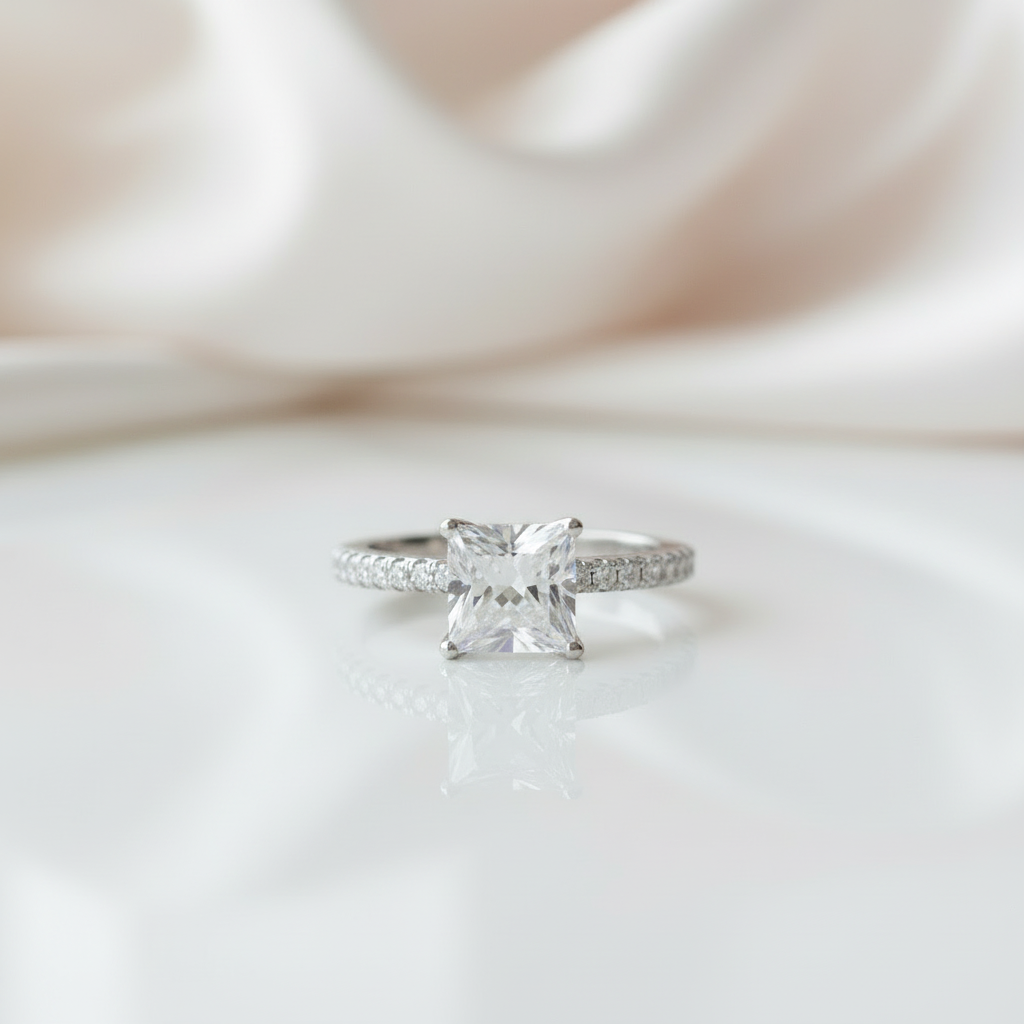 A stunning 1.5 carat princess cut diamond engagement ring crafted from lab-created diamonds and solid 925 sterling silver. This piece delivers brilliant sparkle and lasting durability, perfect for celebrating your commitment with timeless elegance.