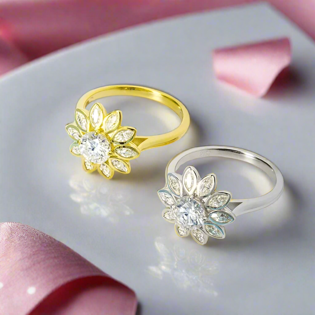 Add a touch of elegance to your jewelry collection with our 6mm Round Cut Certified Moissanite Flower Engagement Ring from Black Diamonds New York. Made with top-notch craftsmanship and high-quality 925 silver dipped 5x in 18K gold, this ring is both affordable and eye-catching. The sparkly moissanite stone set in a gorgeous flower shape will make you feel like a princess every time you wear it.