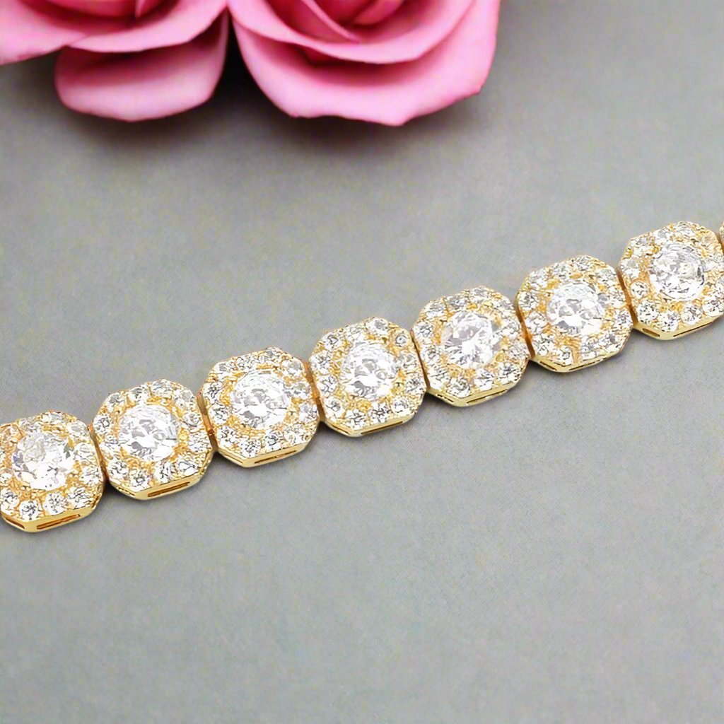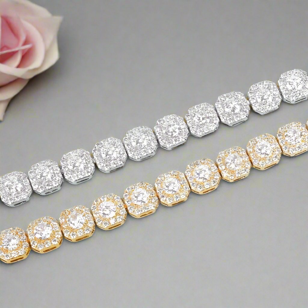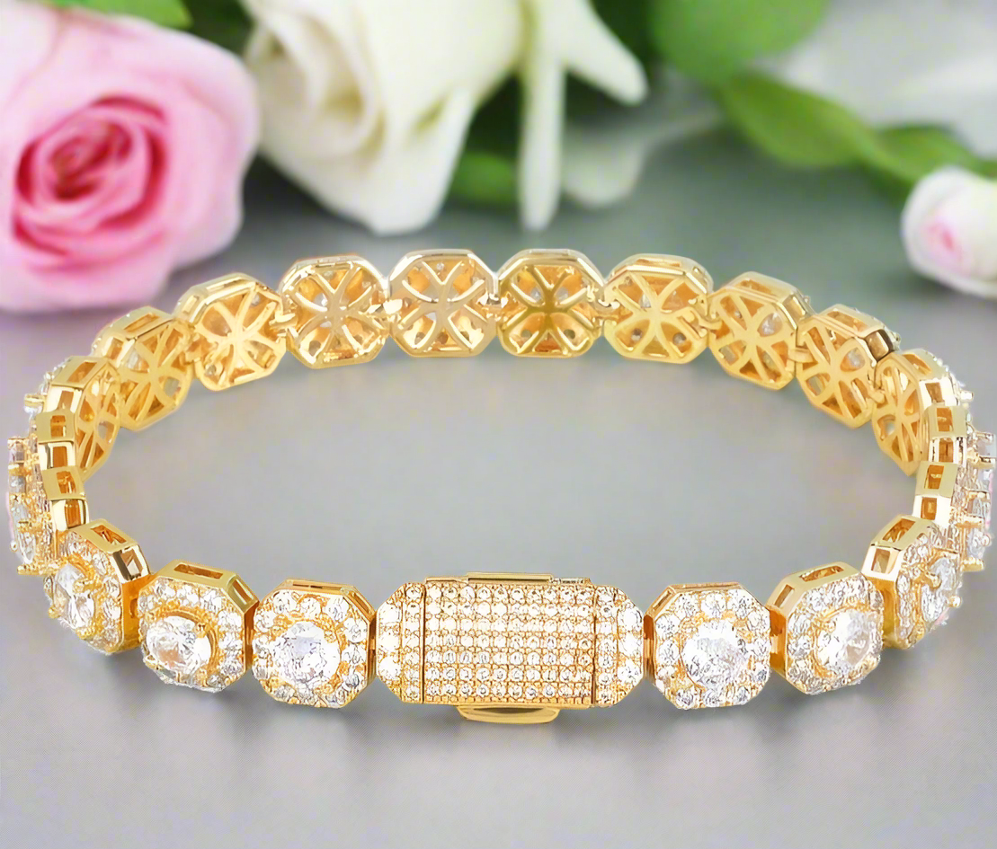 Experience the ultimate in urban style with our Square Hip Hop Diamond Bracelet. Crafted from quality silver with a stunning yellow gold plating, this bracelet features a 9mm round cut certified Moissanite stone at its center, accented by sparkling Created diamonds on the sides. Make a bold statement and elevate your accessory game with this must-have piece.