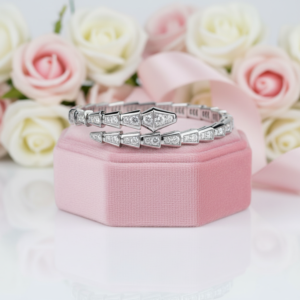 This Round Cut Moissanite Snake Bangle delivers genuine sparkle without the premium price tag. Crafted from 925 silver with a five-layer 18k white gold finish, it's built to last while maintaining that luxurious look. The brilliant round-cut stone catches the light beautifully, making it a versatile piece that works for everyday wear or special occasions. Simple, elegant, and affordable—exactly what you're looking for in a quality bangle.