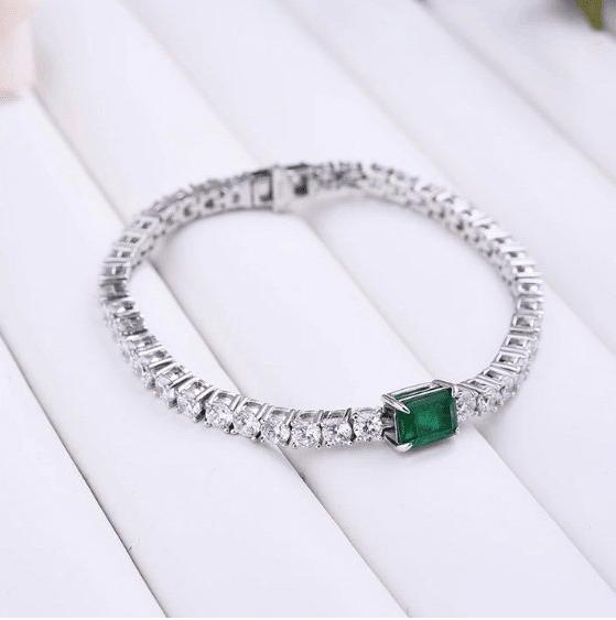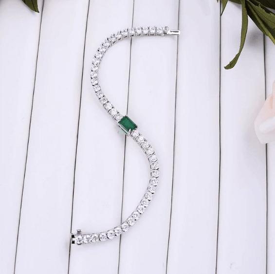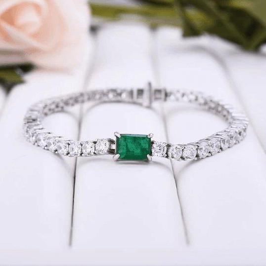 Capture the essence of elegance with this exquisite Green Emerald Cut Diamond Bracelet. Made with 925 Sterling Silver in a stunning White Gold plating, this piece features sparkling simulated diamonds in a round cut to add a touch of glamour to any outfit.