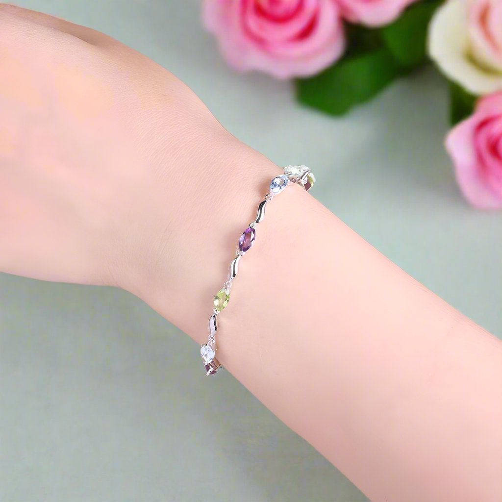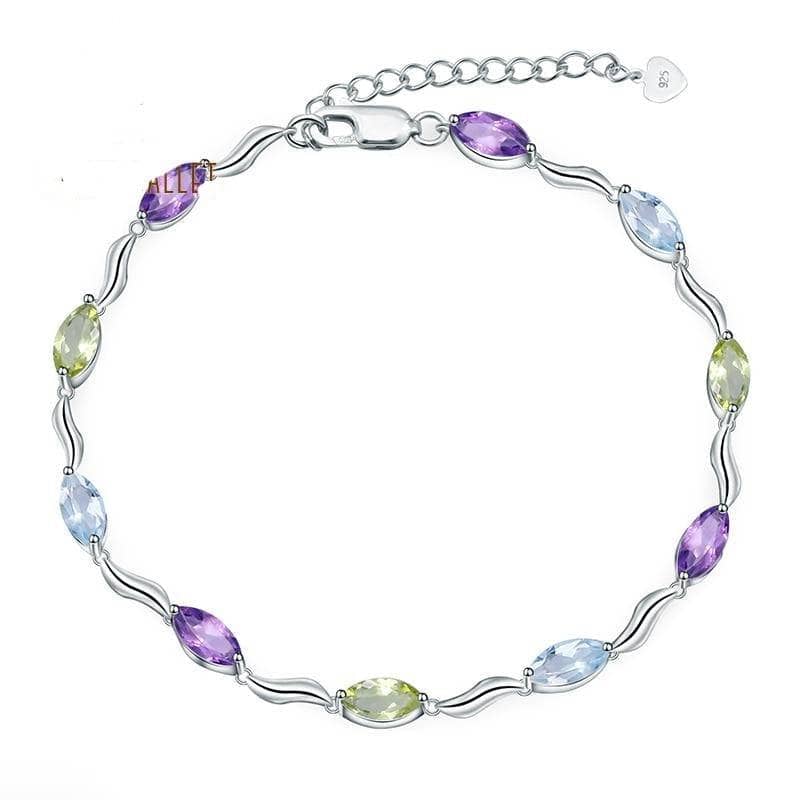 Add a touch of elegance to your look with our Marquise Cut Sky Blue Topaz, Peridot & Amethyst Bracelet. The gorgeous combination of mixed gemstones creates a captivating sparkle that will surely catch everyone's eye. This high-quality piece is a must-have for any jewelry lover who wants to make a statement without breaking the bank.