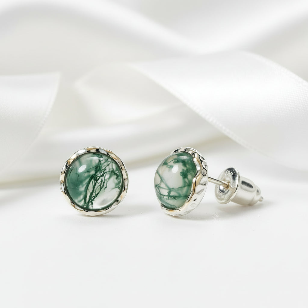 Round Moss Agate Classic Stud Earrings