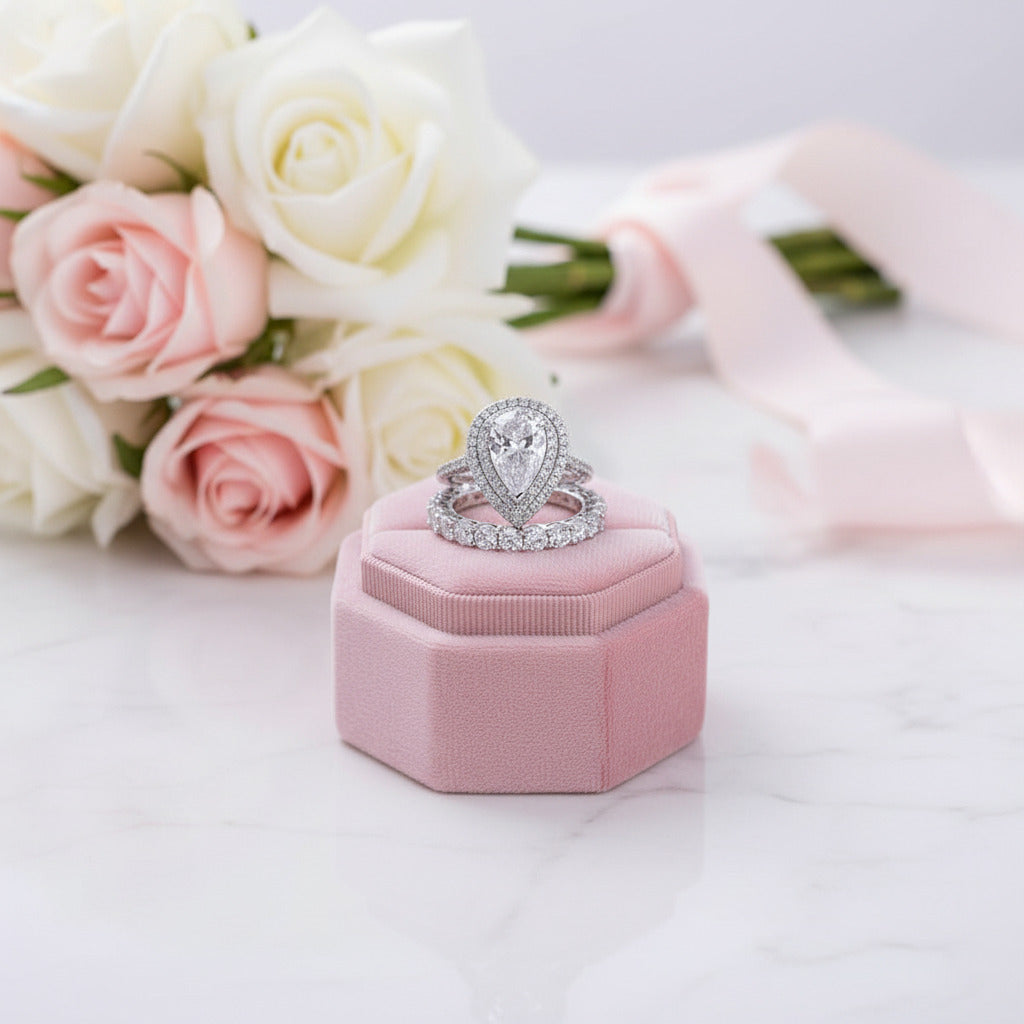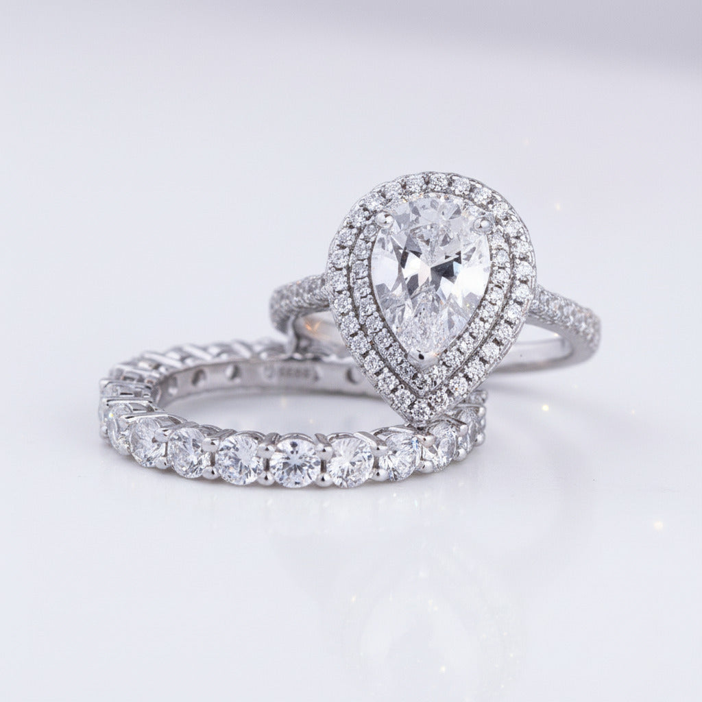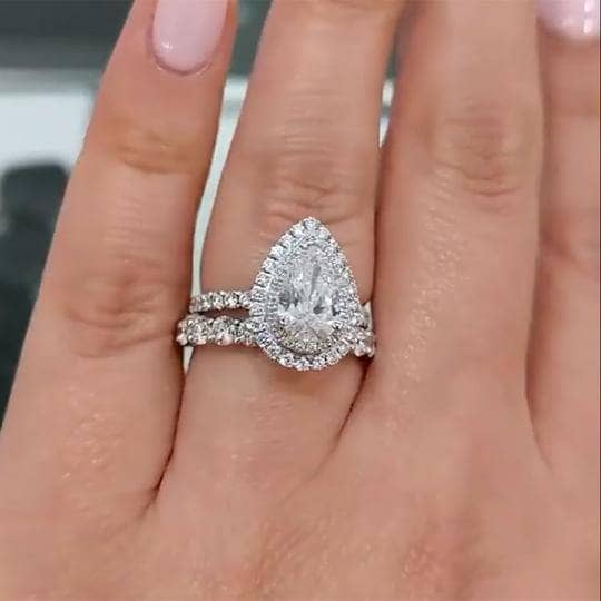 A timeless pear-shaped diamond takes center stage in this elegant wedding set, surrounded by a double halo of sparkling stones that amplify its brilliance. The design combines classic sophistication with modern glamour, creating a striking silhouette that captures light from every angle. Perfect for those seeking a distinctive yet refined bridal look that stands the test of time.