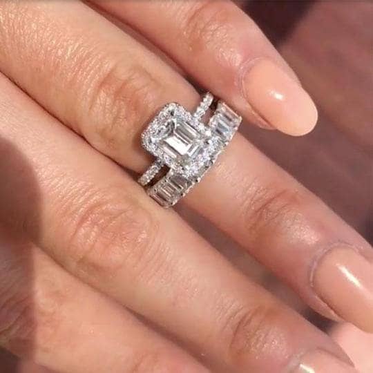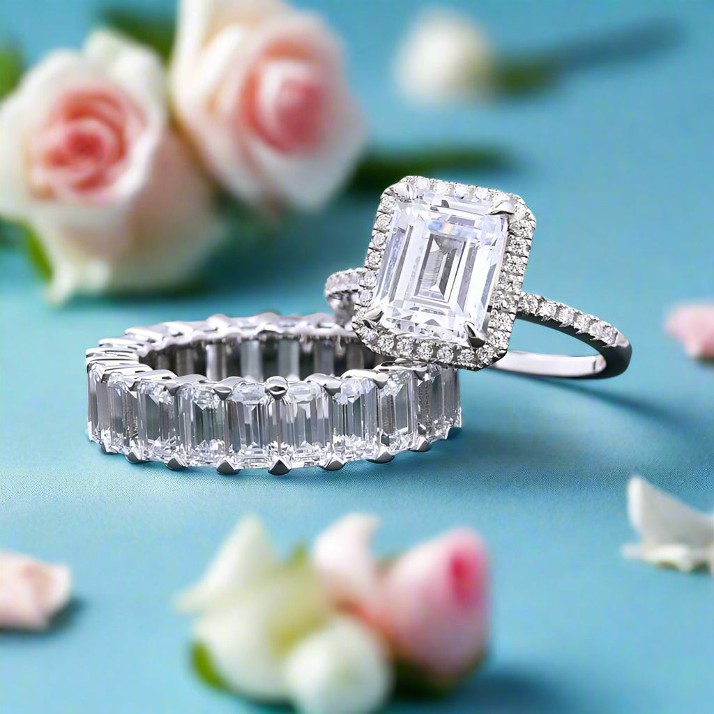 Halo Emerald Cut Ring & Diamond Wedding Band Set