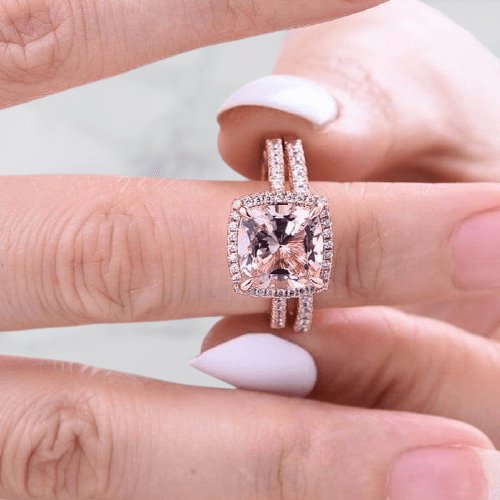 Rose Gold Halo Cushion Cut Peachy Pink Stone Wedding Ring Set