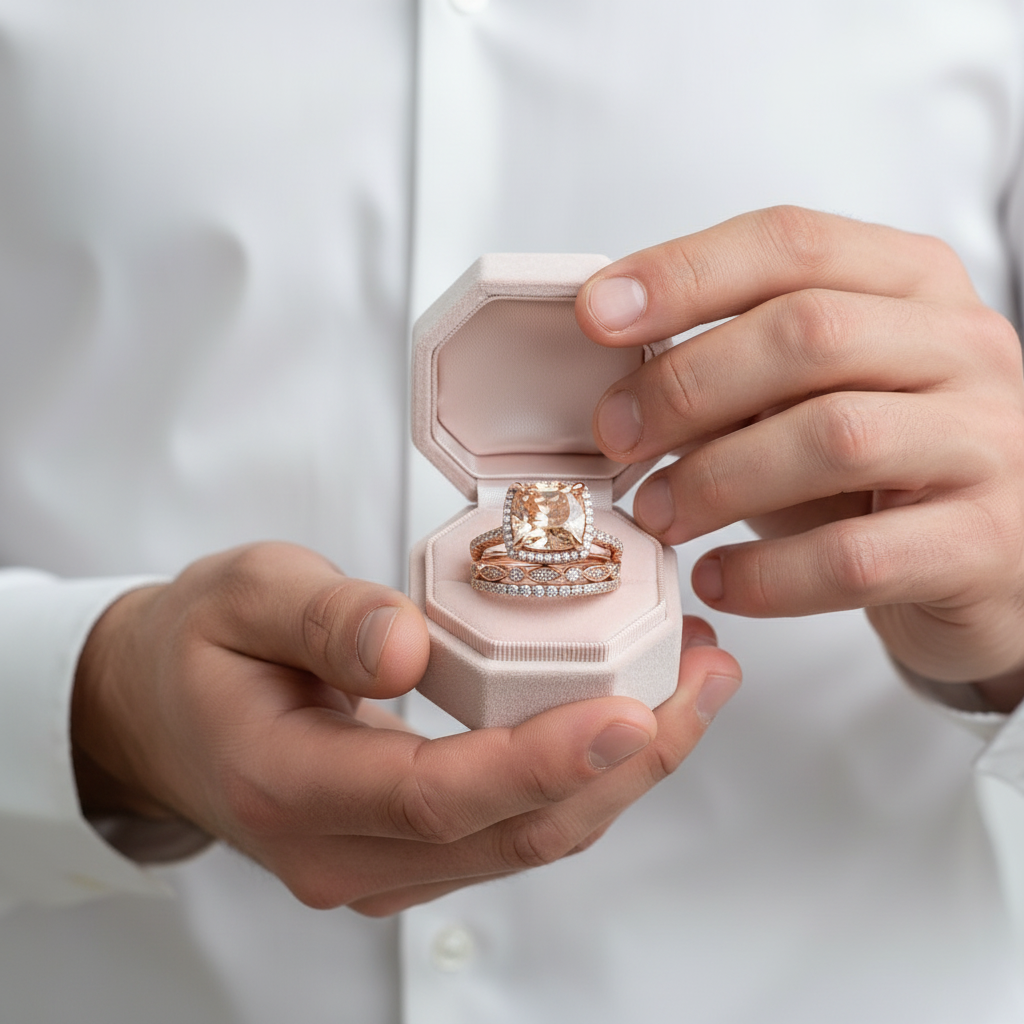 A stunning three-piece ring set featuring cushion-cut champagne stones in rose gold. Handcrafted with exquisite detail, this versatile set works beautifully as an engagement ring, wedding band, or anniversary gift. Perfect for any special occasion.