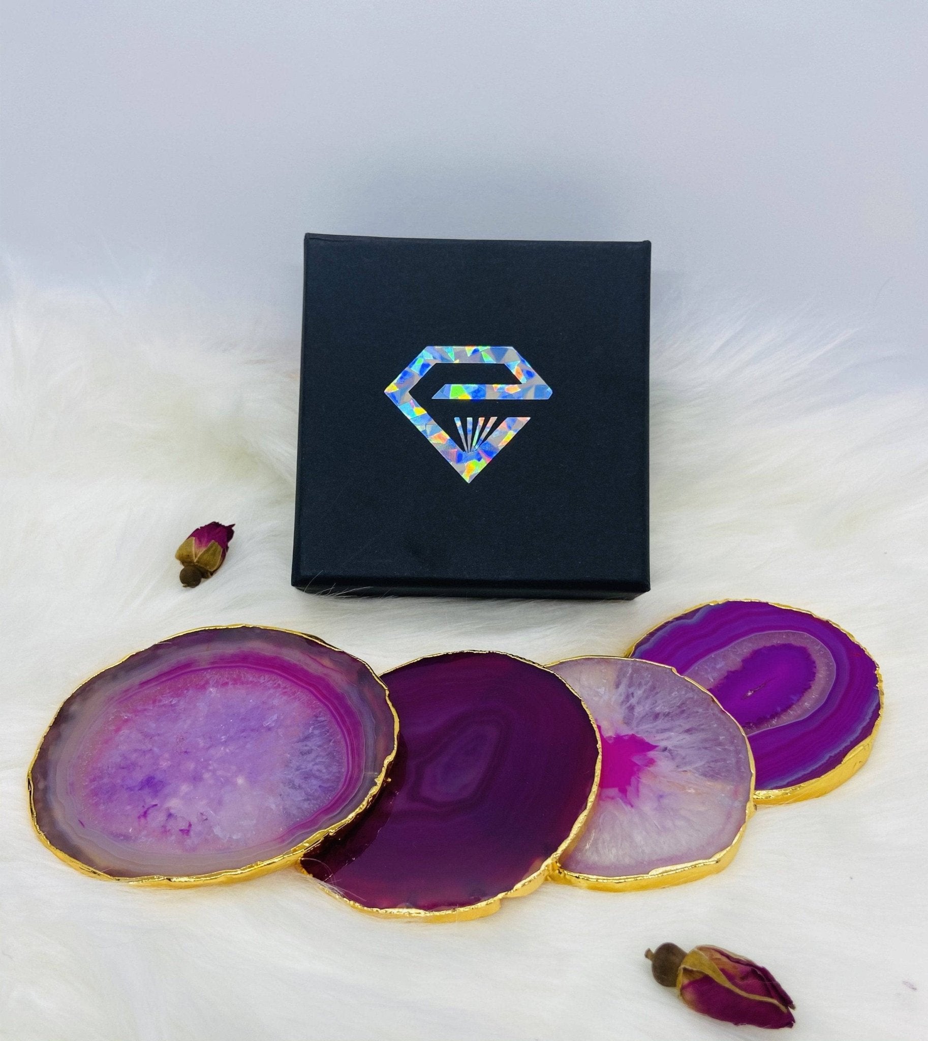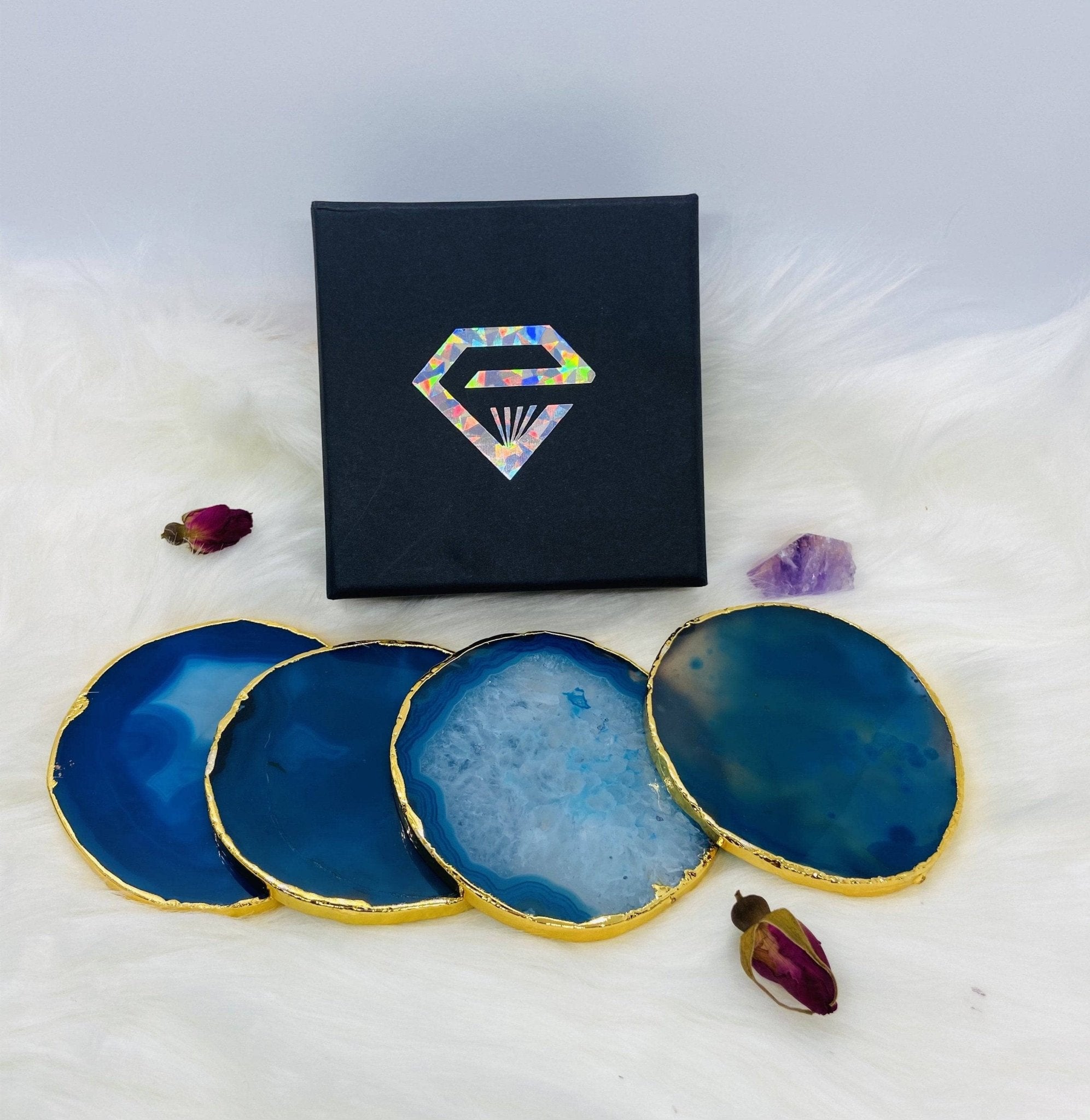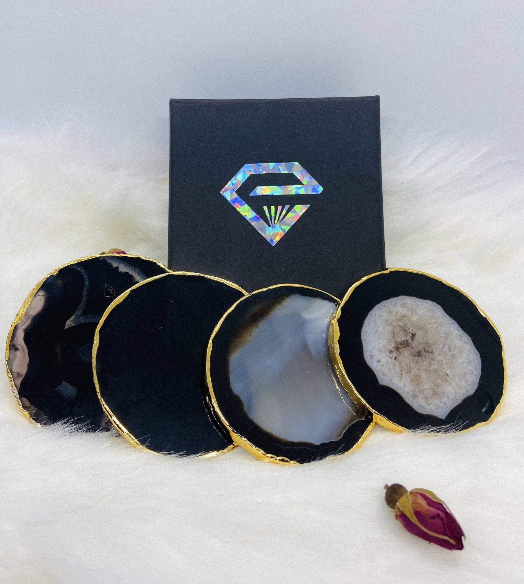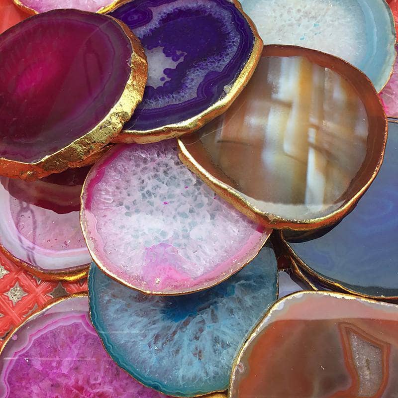 Tables don't have to be boring. Dress them with our luxury 100% slices of luminous natural quartz agate coasters. Polished by hand and rimmed in 14k gold. Robust yet elegant! Beauty that doesn't fade.