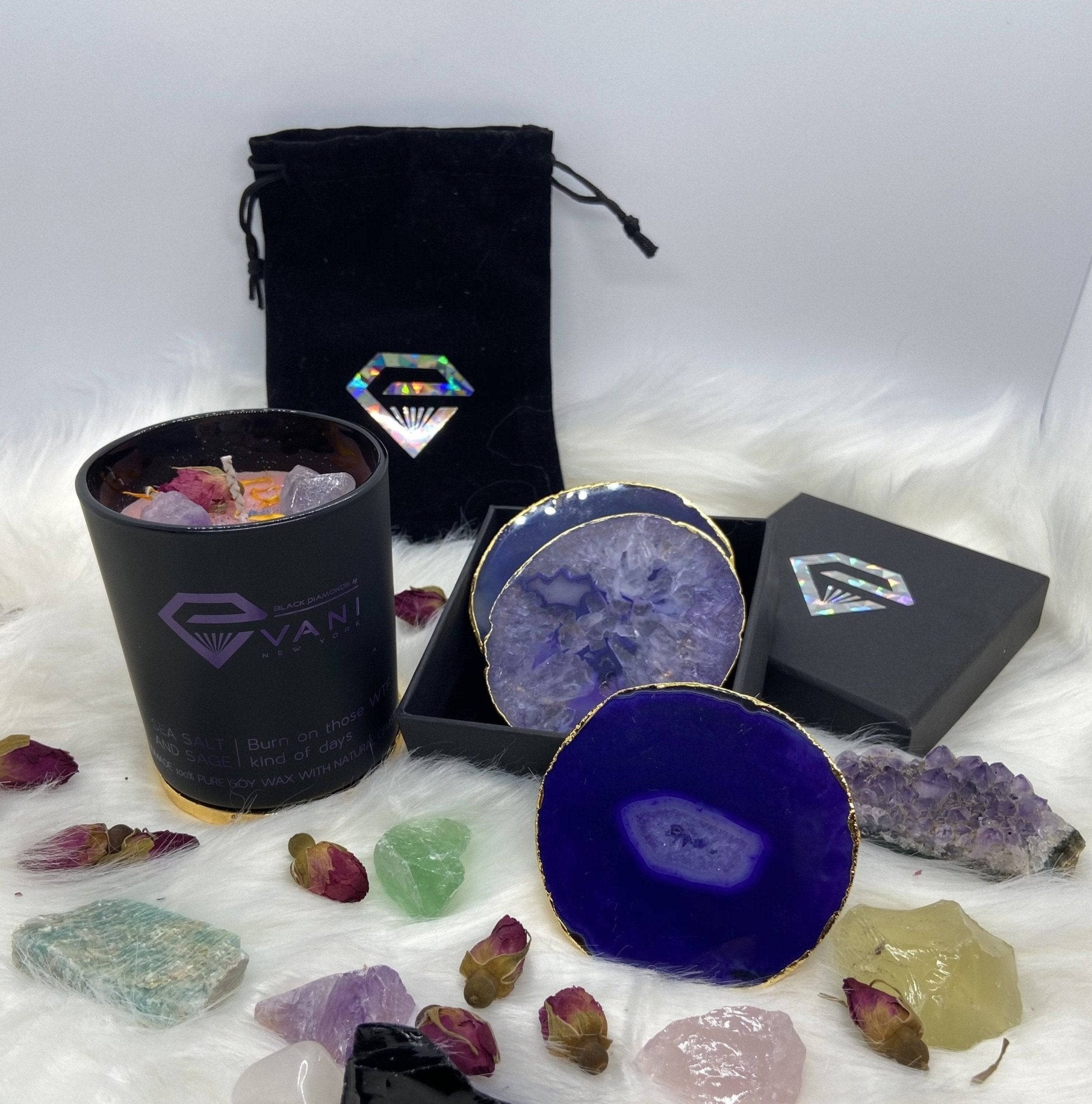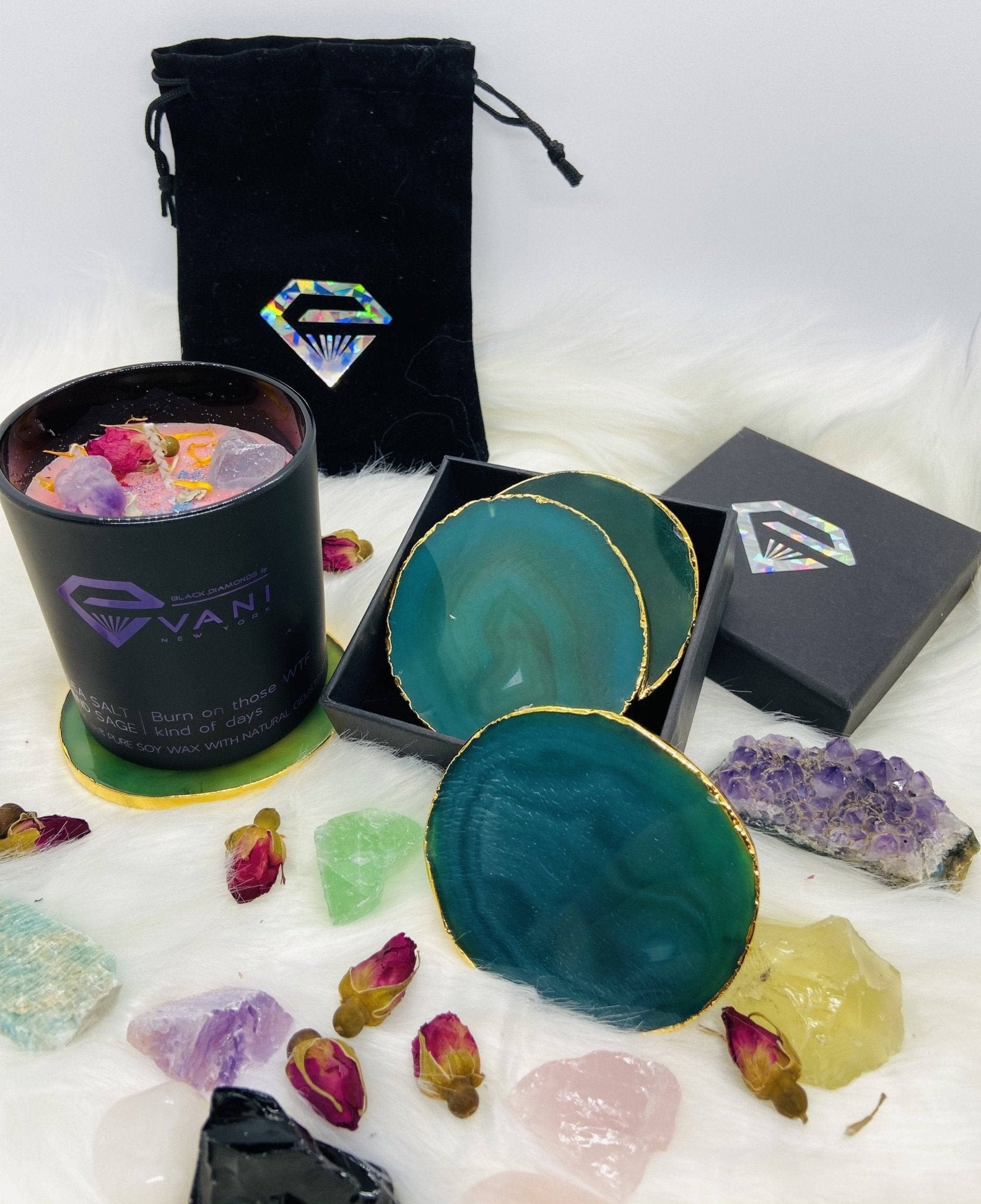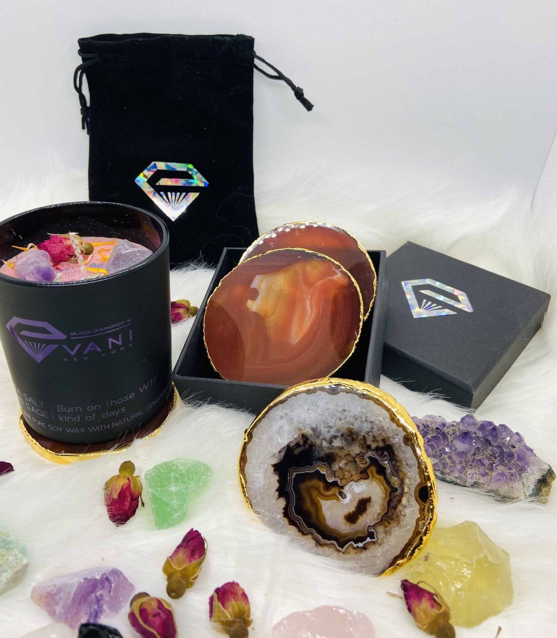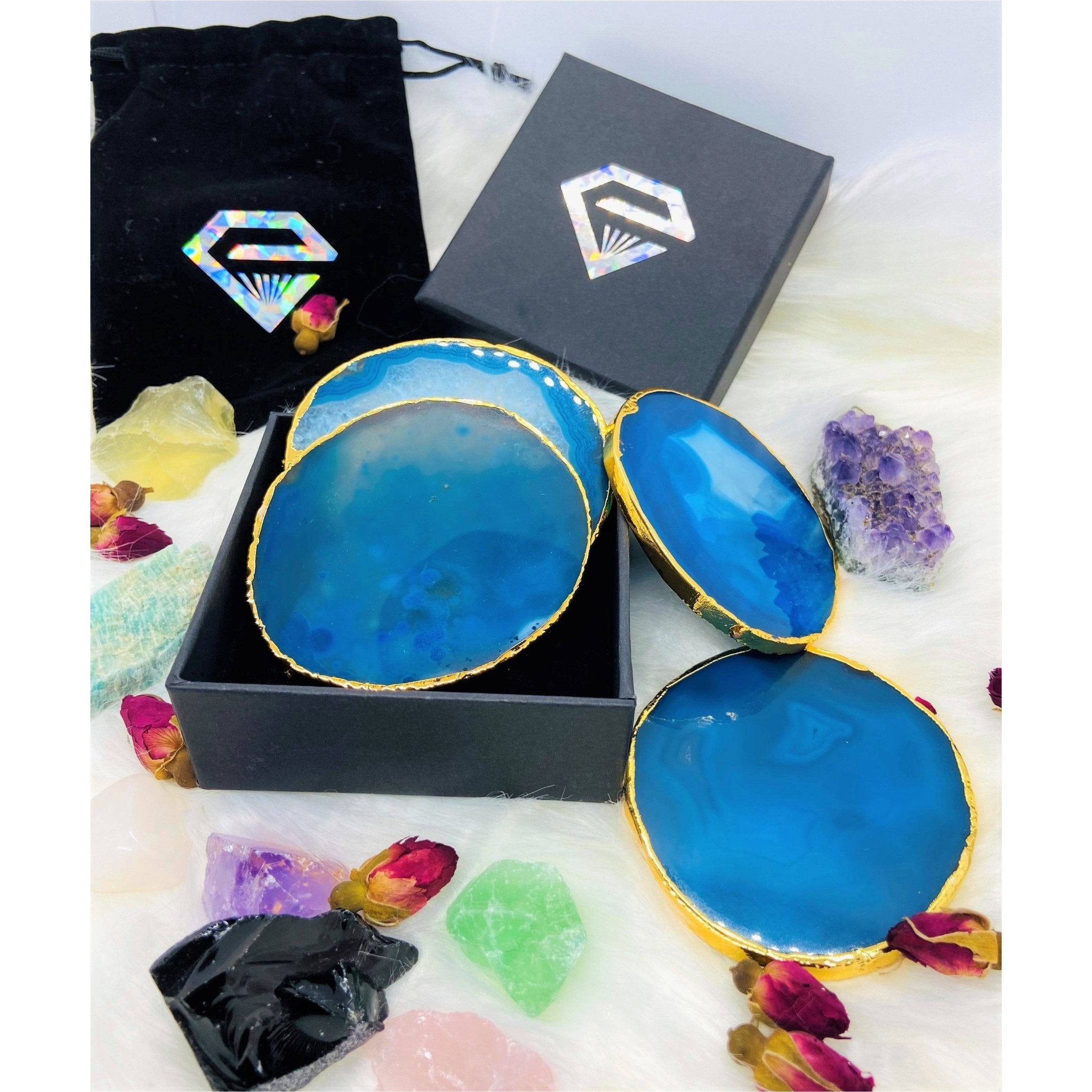 Tables don't have to be boring. Dress them with our luxury 100% slices of luminous natural quartz agate coasters. Polished by hand and rimmed in 14k gold. Robust yet elegant! Beauty that doesn't fade.
