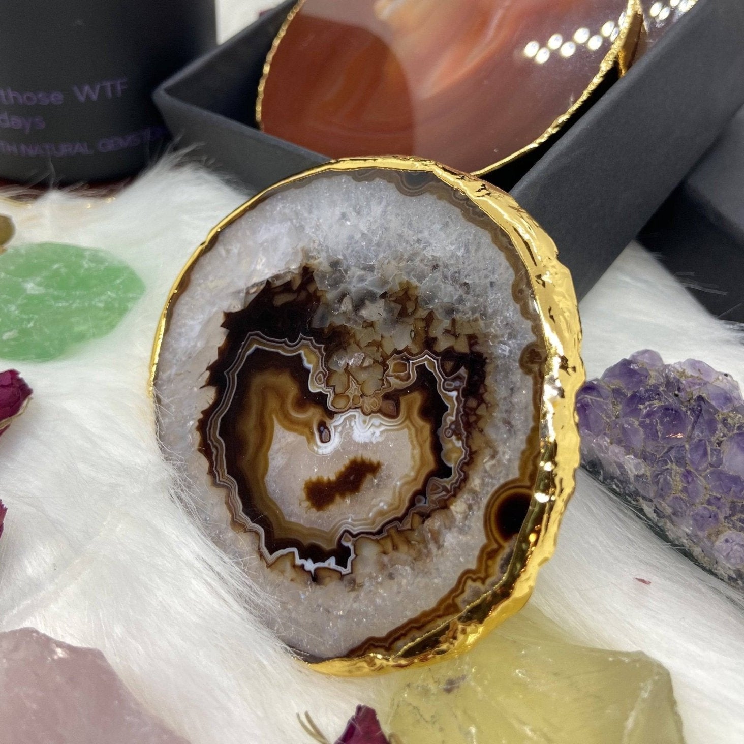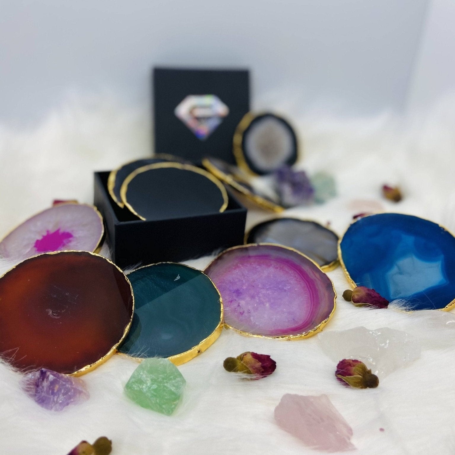 Tables don't have to be boring. Dress them with our luxury 100% slices of luminous natural quartz agate coasters. Polished by hand and rimmed in 14k gold. Robust yet elegant! Beauty that doesn't fade.