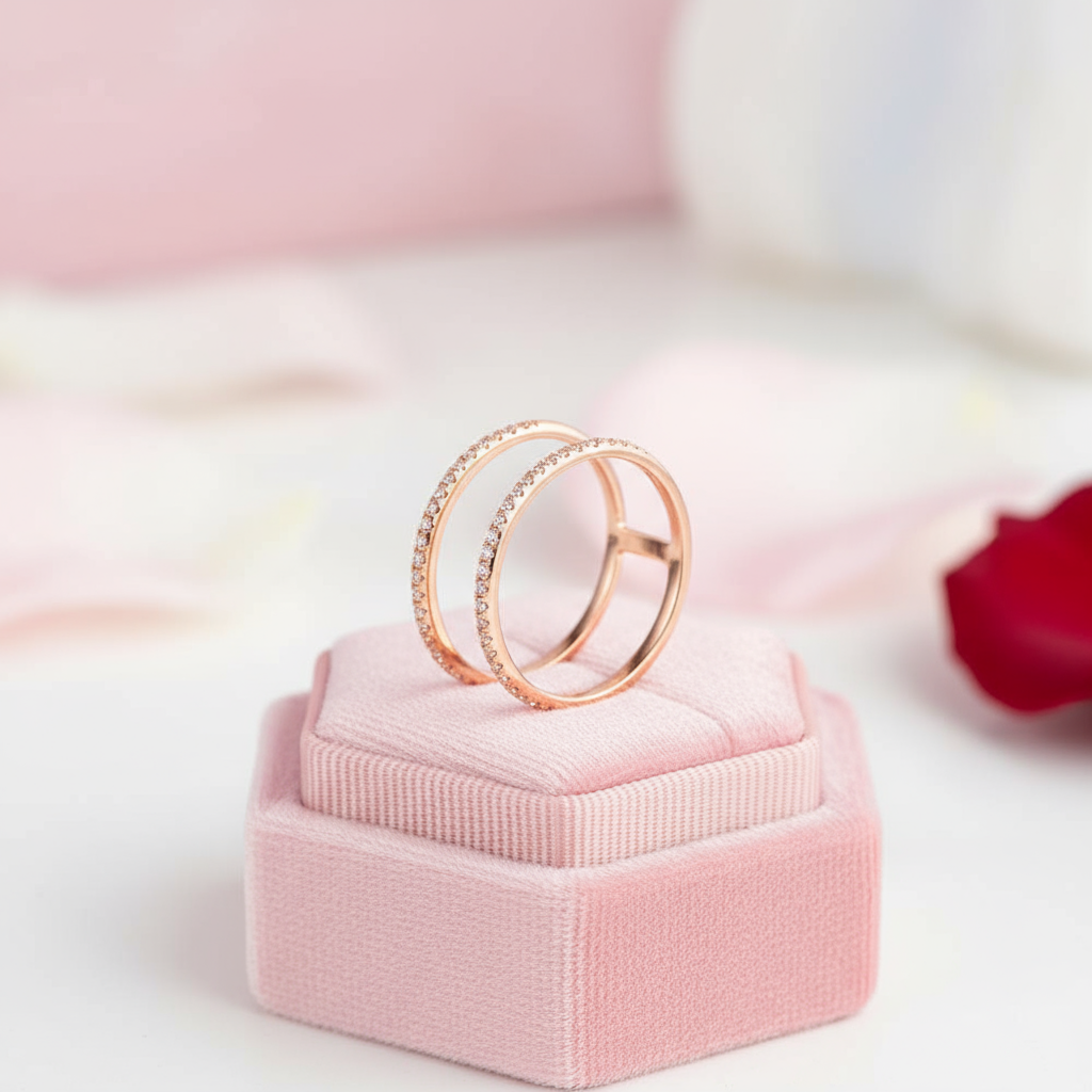 An exquisite expression of refined elegance, this double band ring unites a 0.18 ct natural diamond with lustrous 14k rose gold. Meticulously handcrafted to reveal unparalleled brilliance, it embodies timeless sophistication. A distinguished choice for those who appreciate enduring beauty and exceptional craftsmanship.