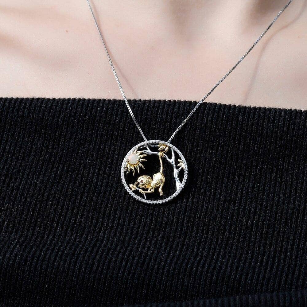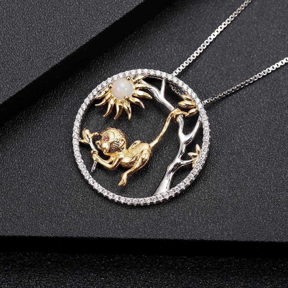 Year Of The Monkey - Natural African Opal Monkey Necklace crafted from 925 sterling silver with gold plating. The pendant measures 25.49mm and features a 4x4mm, 0.45-carat African opal as the main stone, complemented by nano garnet and diamond alternative side stones. The silver weight is 3.37g, with a total pendant weight of 3.51g, combining exquisite materials for a refined and elegant accessory.