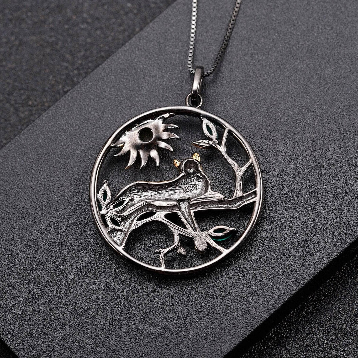 Introducing the Year of the Tiger necklace, featuring a natural citrine and green agate leopard resting on a tree. This elegant piece is crafted from 925 sterling silver with gold plating. The pendant includes citrine and green agate stones measuring 5x5mm and 2.5x5mm respectively, with carat weights of 0.47 Ct and 0.81 Ct. Accented by nano citrine and nano emerald stones, the necklace has a silver weight of 8.08g and a total ring weight of 8.47g, combining refined craftsmanship with timeless beauty.