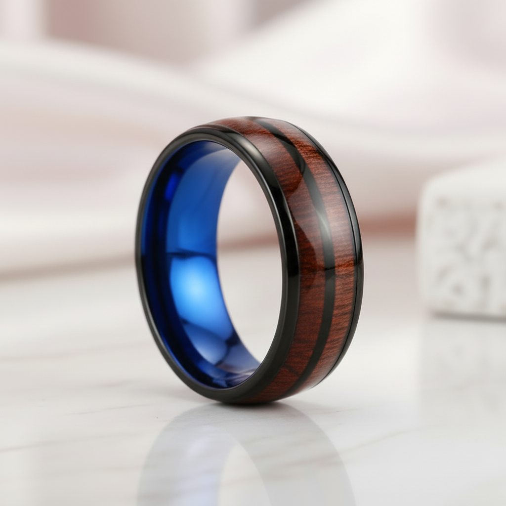 Black and Blue Dome Double Groove Acacia Wood Inlaid Tungsten Men's Ring