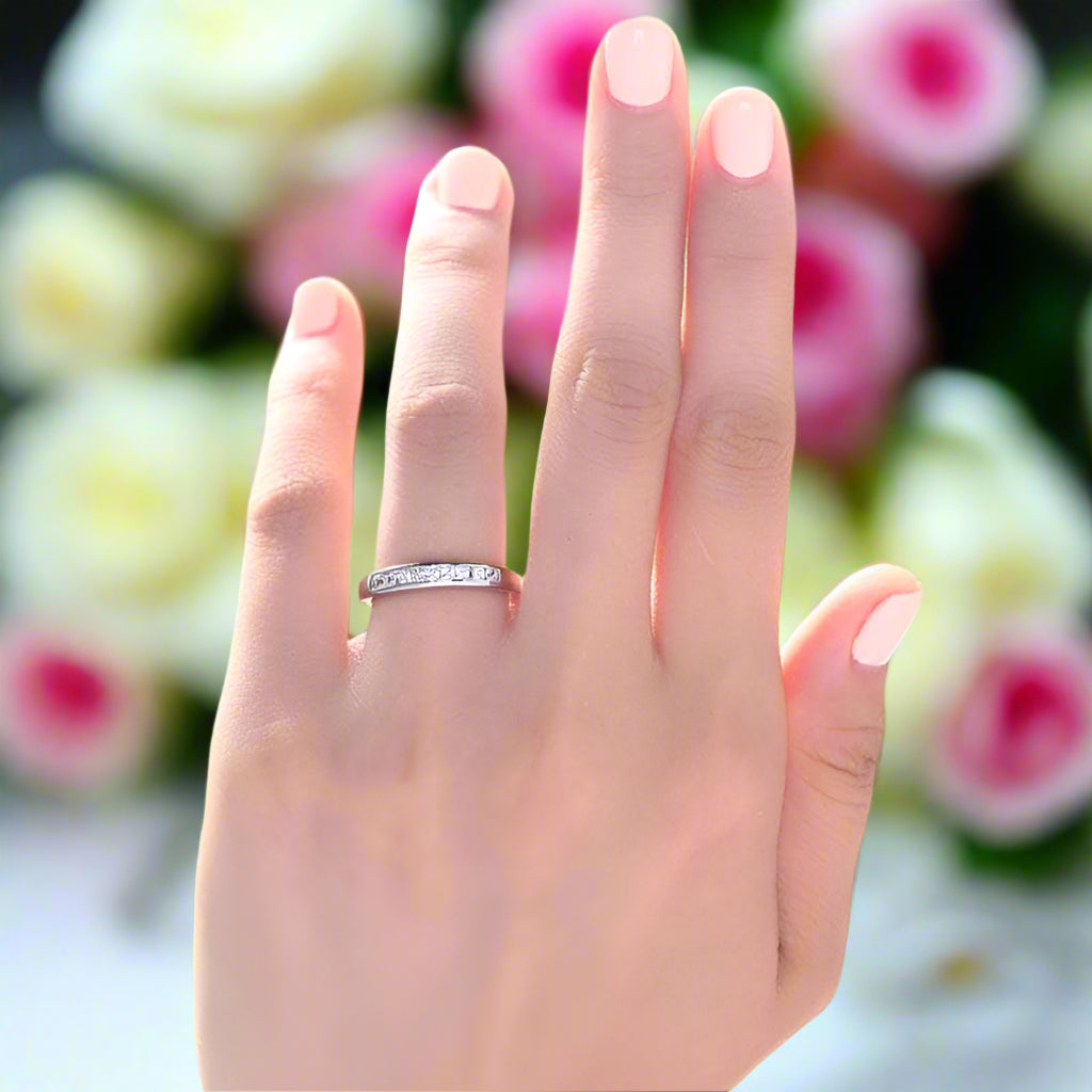 Indulge in luxury with our Channel Set Princess Cut Ring, crafted in 925 Sterling Silver and adorned with stunning Diamond Alternatives. The Princess Cut stones, measuring 2mm in size, are elegantly set in a channel setting and surrounded by a 3.5mm wide band. Finished with a high polish and plated in rhodium, this ring exudes sophistication and exclusivity.