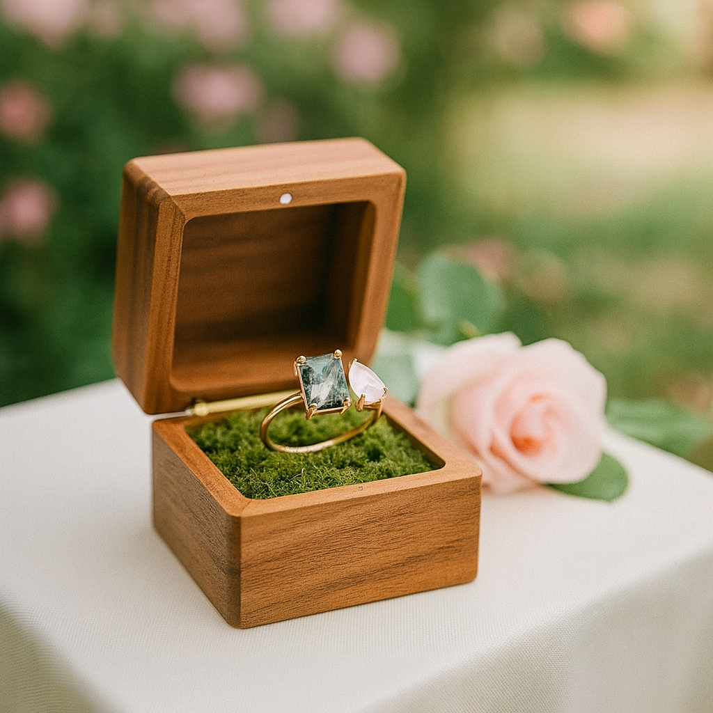 Fall in love with the heavenly beauty of our Milky Blue Moonstone Moss Agate Engagement Ring. The emerald-cut moss agate and the exquisite pear-cut moonstone are held in place by sturdy prongs that ensure their durability. This dual-stone engagement ring is a unique combination that is sure to make heads turn.