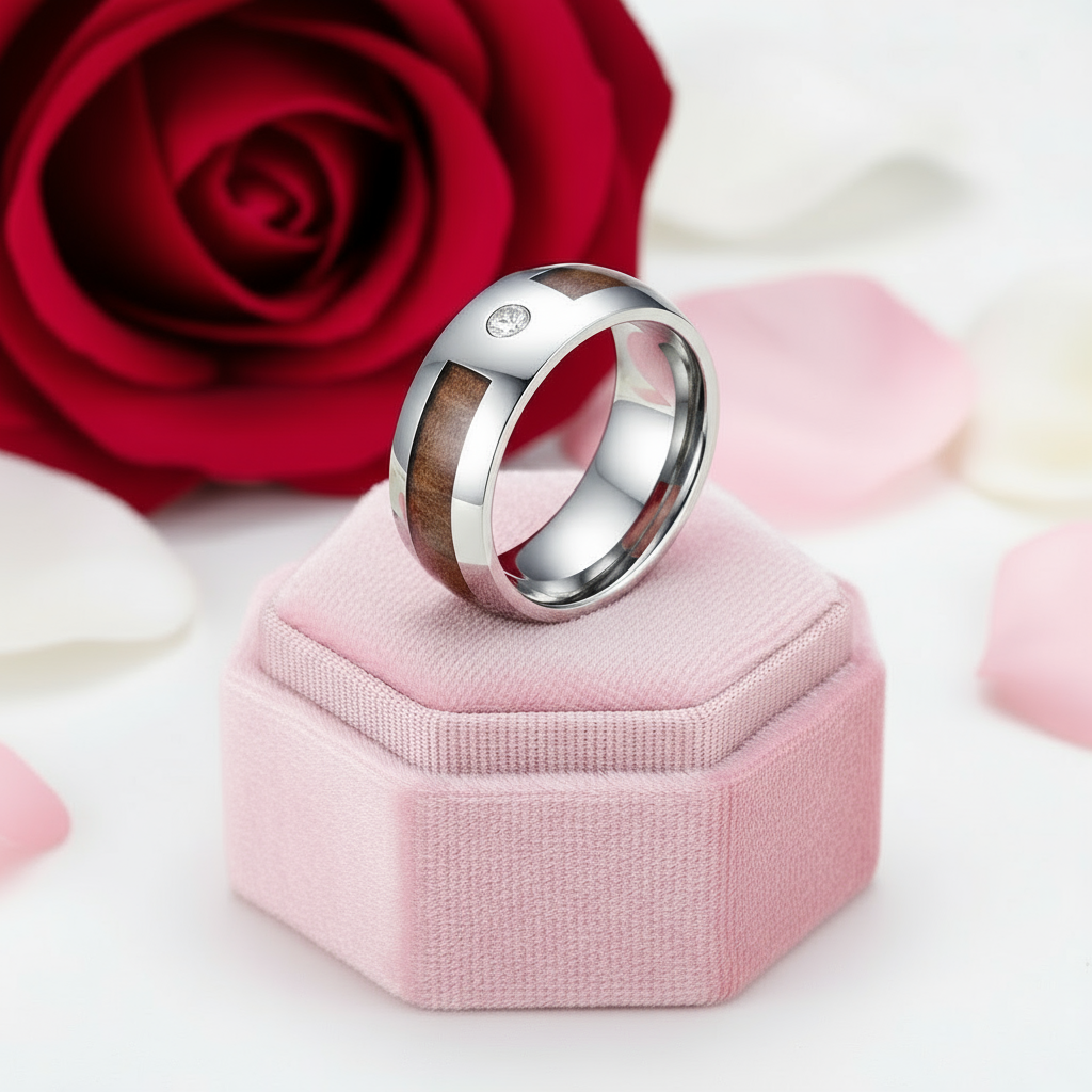 Crafted from premium, ethically sourced materials, this Wood Inlay Men's Tungsten Carbide Wedding Band with Diamond is designed for enduring elegance. Elevate your commitment with a unique alternative to conventional, costly wedding rings.