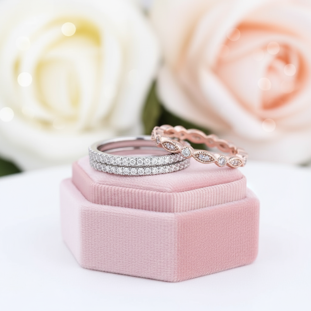 Rose gold ring and diamond ring on a pink velvet box with blurred flowers in the background